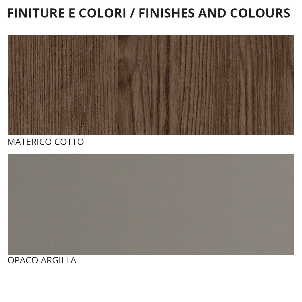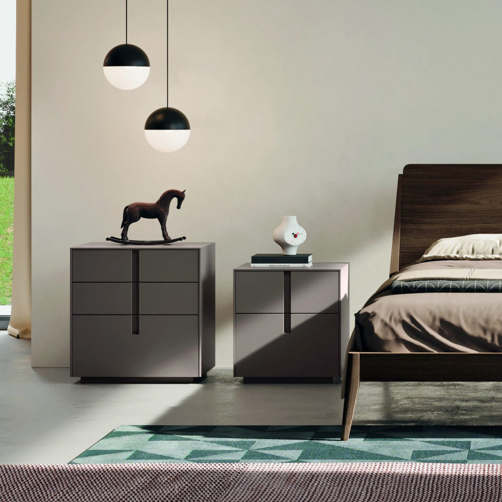 mattlackerat trä med en lerfinish utrustad med 2 praktiska lådor som kan öppnas genom ett spår på framsidan, ett tredje sängbord och en byrå med 3 lådor med samma systemöppning i samma finish. Denna lösning kombinerar