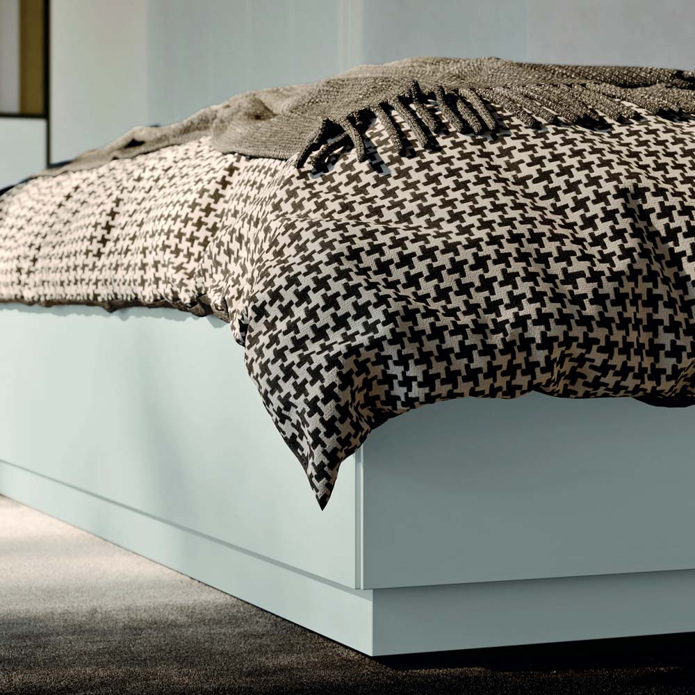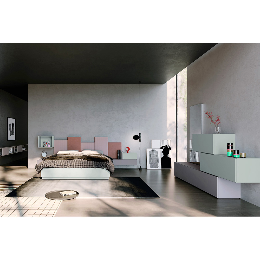 dubbelsäng med en sängram i mattlackerat trä med fjäderfinish, två sängbord varav ett är modulärt, en byrå, även det modulärt, samt ett kvadratiskt väggskåp i mattlackerat trä med fjäder och hortensia finish. En inredningsidé som ger oändliga möjligheter att drömma tack vare ett