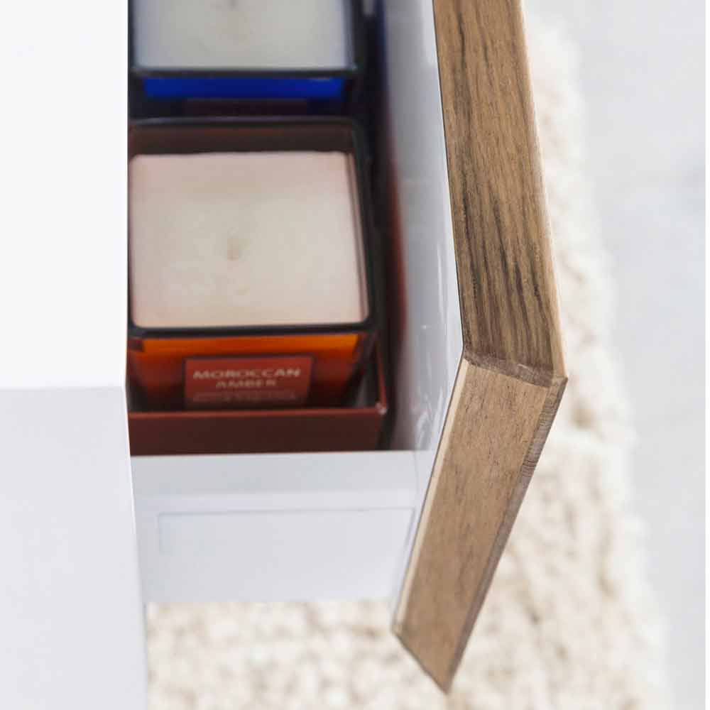 Upphängt badrumsskåp i teak och Hi Macs® Burma Teak och dess mjuka och varma nyanser möter den eteriska vitheten hos