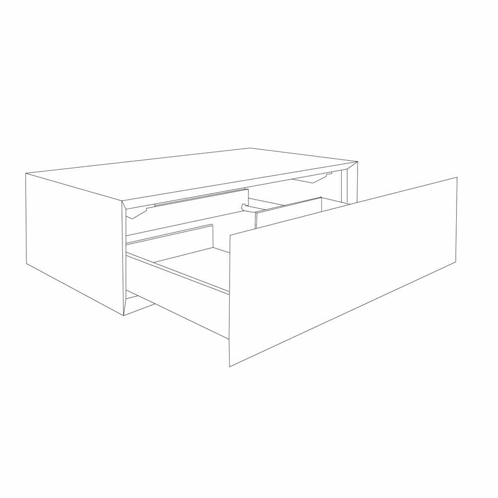 naturlig akrylsten - Hi Macs® med solid teaklåda, tryck-/dragstängning och predisposition för centralt avlopp. Levereras med fästen och väggfästskruvar. Hålet för kranen kan enkelt göras "på plats" med en vanlig borr.