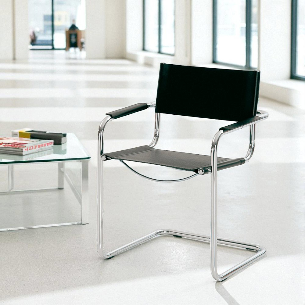 Cirillo- stolen med armstöd för mötesrum eller konferensrum är idealisk eftersom den förkroppsligar alla dessa egenskaper; den har en förkromad metallram och en sits, ryggstöd och armstöd i svart läder.