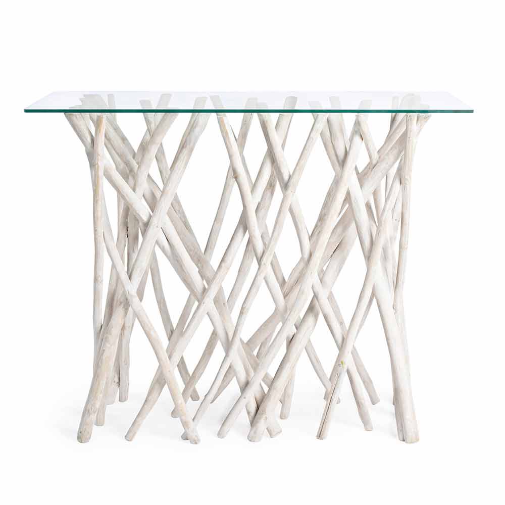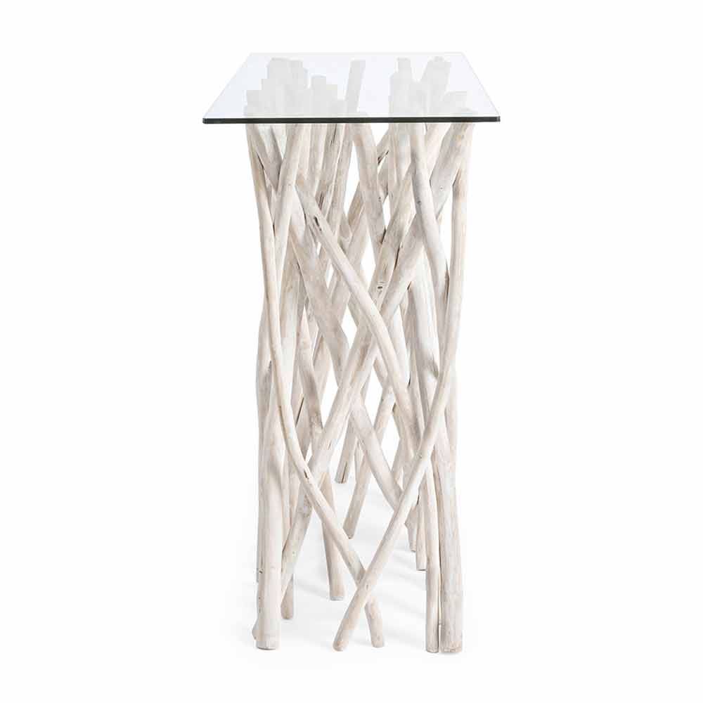 Denna designkonsol är gjord av en 8 mm tjock, icke-härdad glasskiva som stöds av en bas av blekta teakgrenar med en naturlig finish.