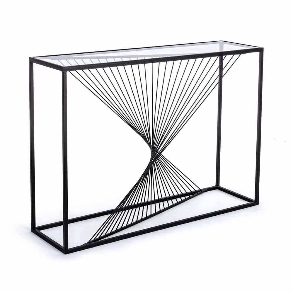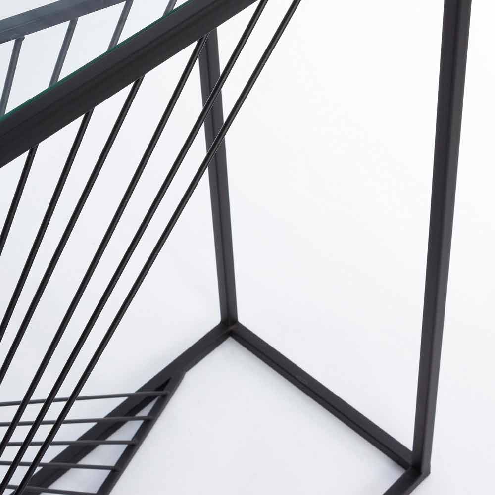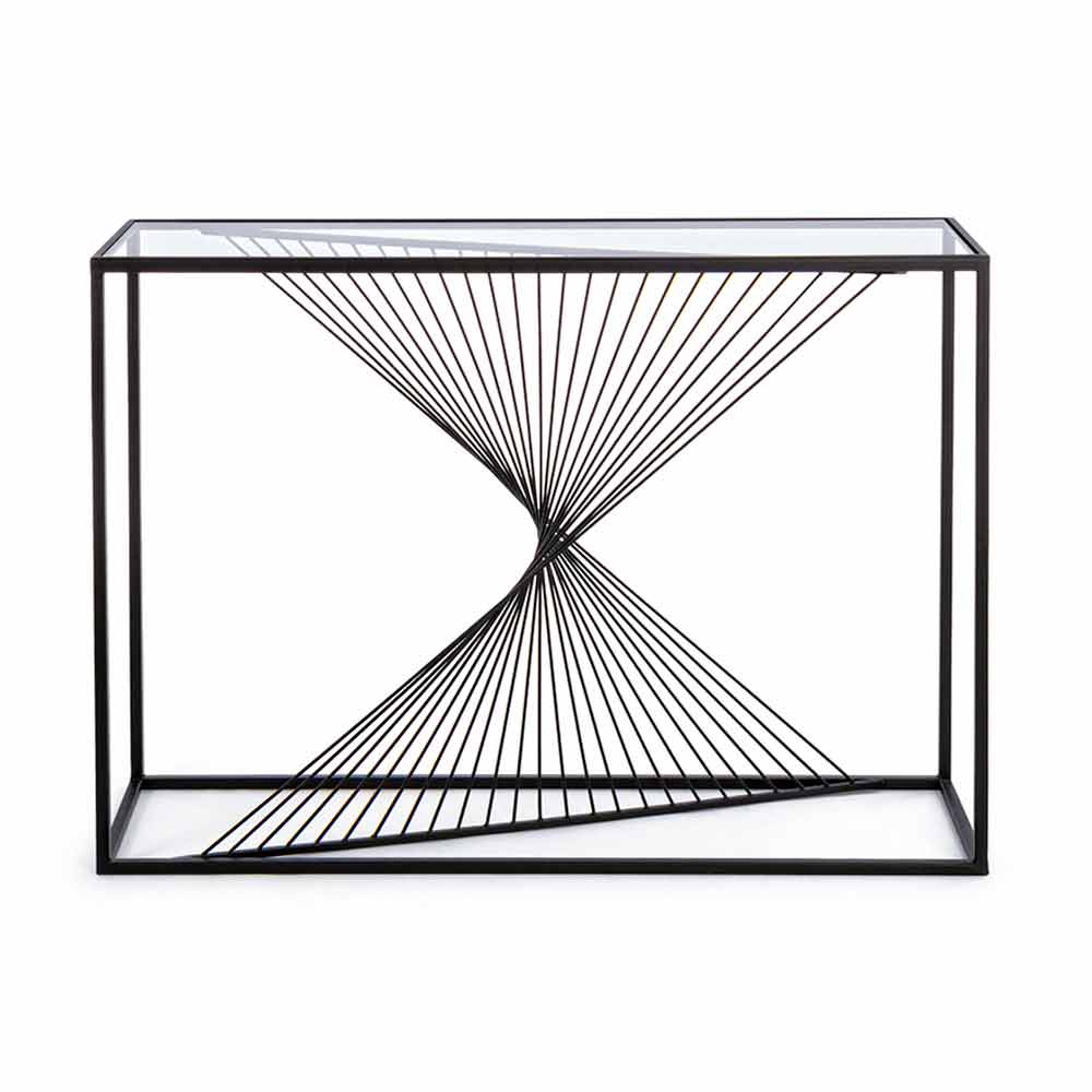 Denna designkonsol har en minimal rektangulär struktur i epoxipulverlackerat stål och en härdat glasskiva .