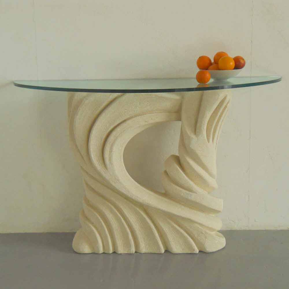 Konsolbord Made in Italy med bas i naturliga Vicenza sten, skuren manuellt från det fasta kvarteret och med 15 cm tjockt floatglas topp, formad elliptisk, vilande på basen.