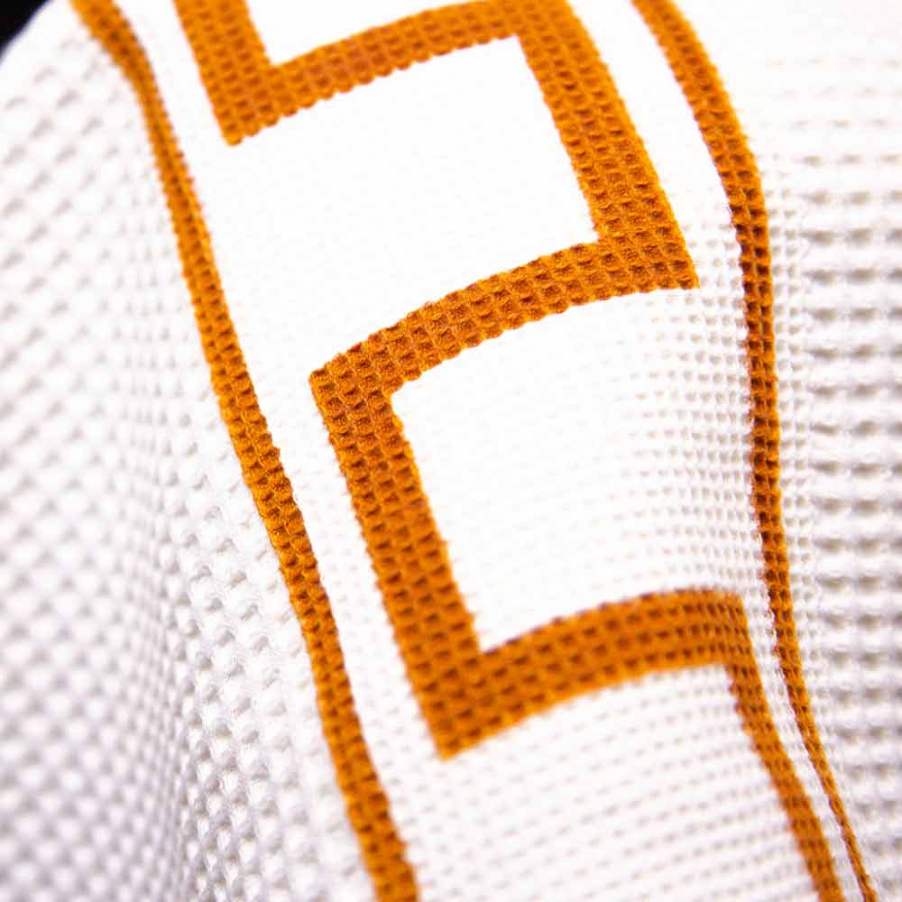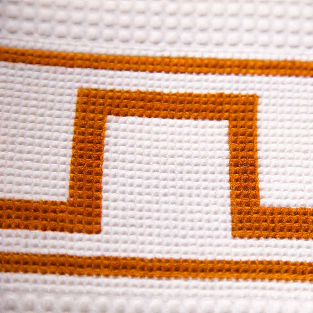 Badhandduk i ren vit bikakebomull med rostfärgad Pompeian grekisk tryck handgjord, handgjord skapelse i Italien unik bit.