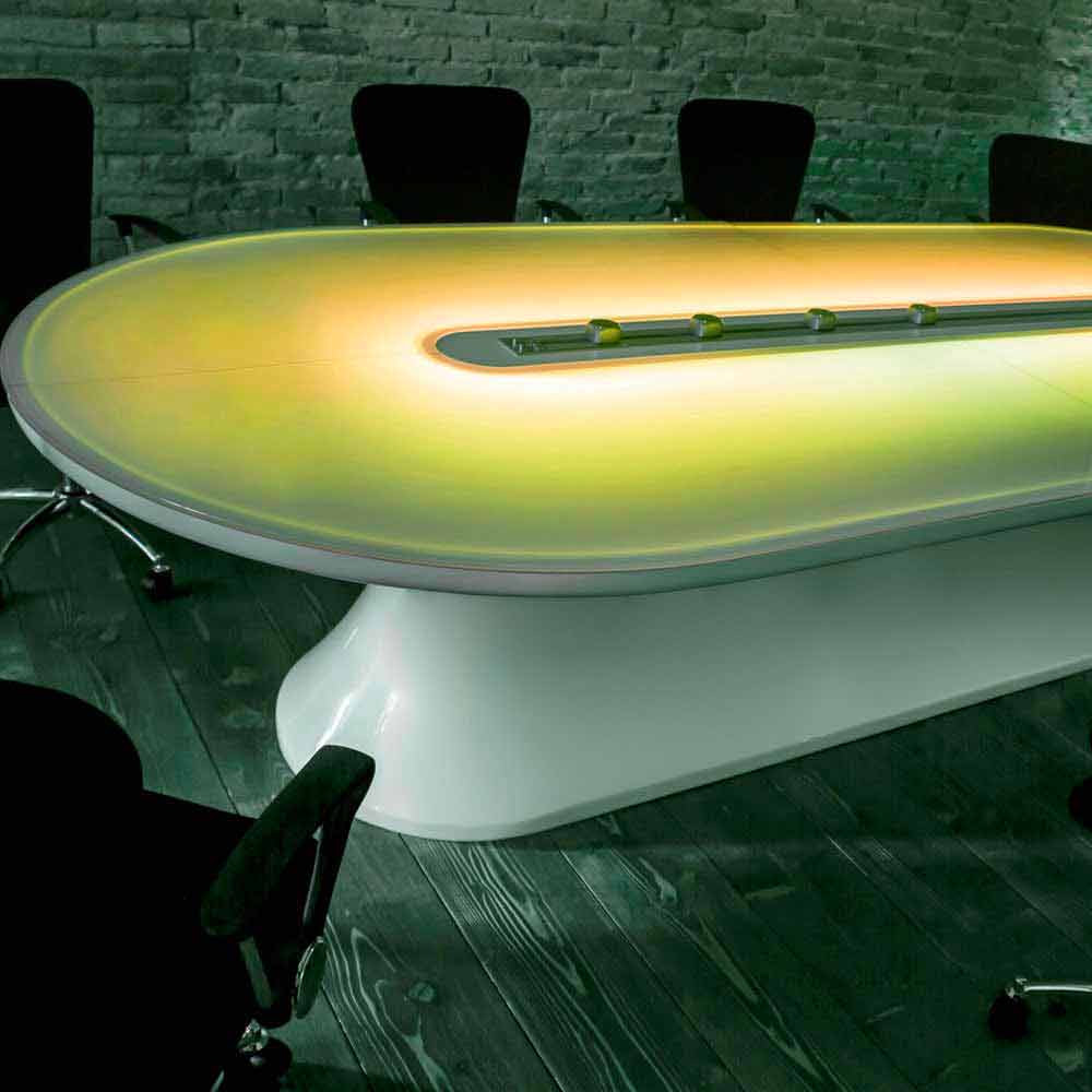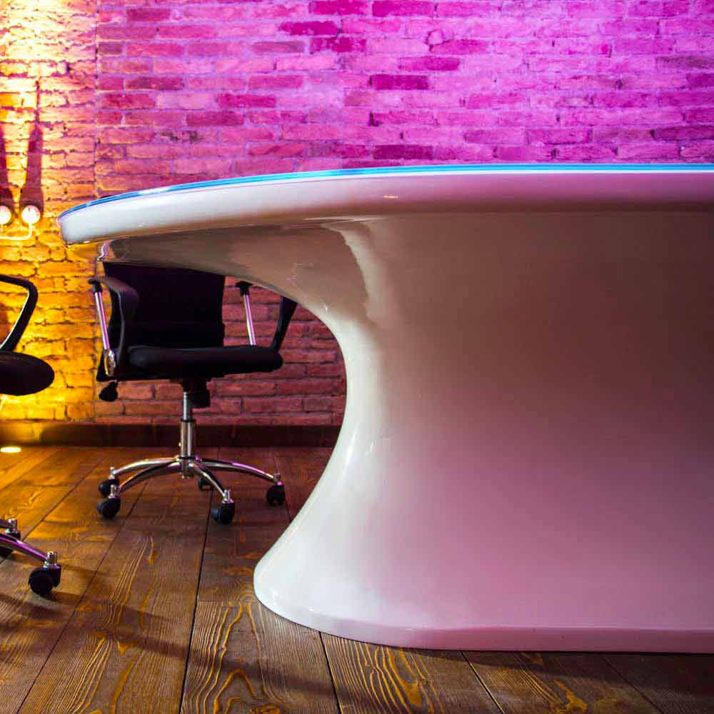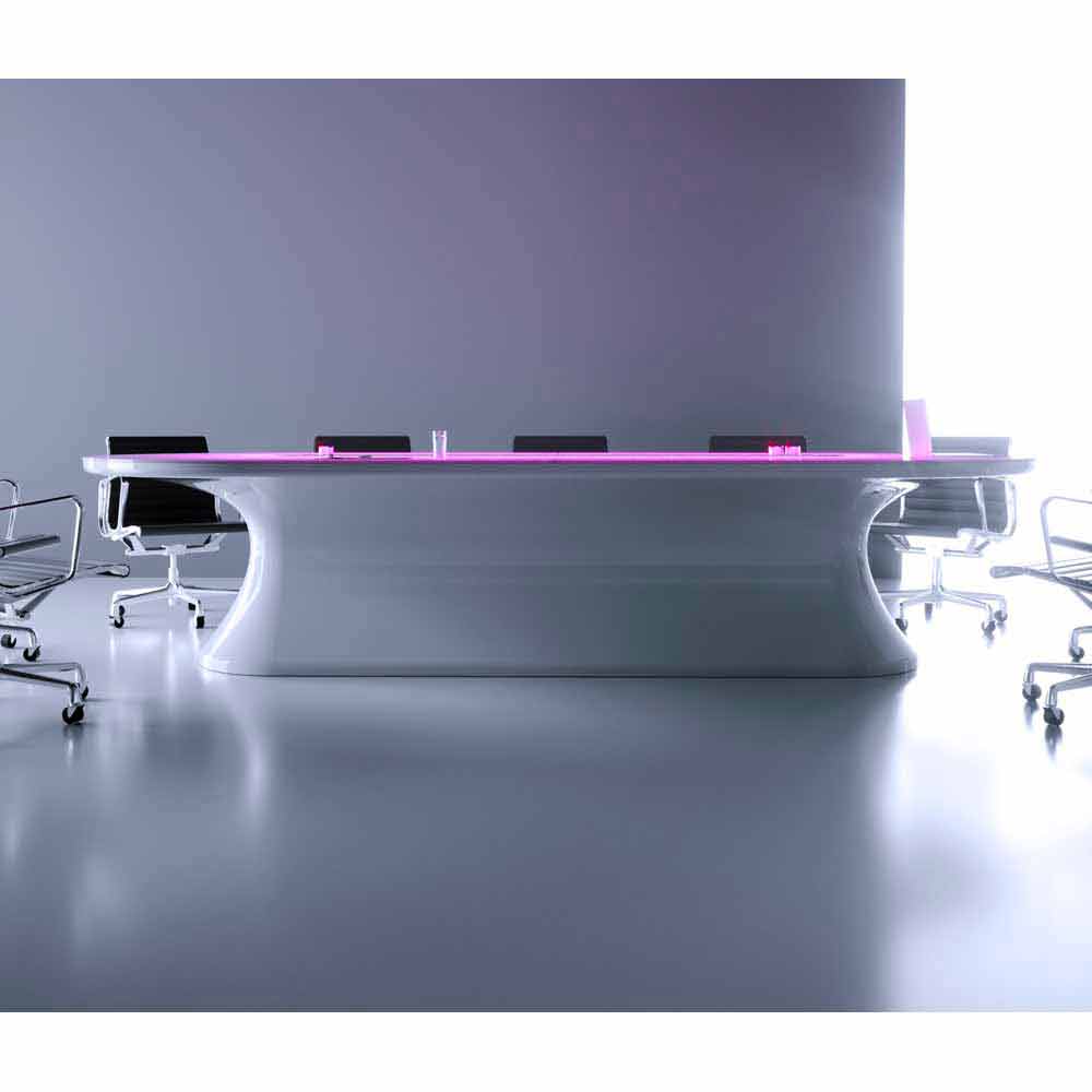 Material: adamatx och glas. Mötesbord av design, elegans och teknik. Med slingrande former och generösa utrymmen är infobord ett riktigt konstverk. Anpassningsbar i färger och storlek. Förutom den estetiska aspekten är infobordet också tekniskt avancerat, tack vare färgterapin av RGB-ljusen under glaset, men framför allt tack vare den elektrifierade stången placerad i mitten av bordet, vilket möjliggör alla typer av anslutningar från vilken plats som helst .