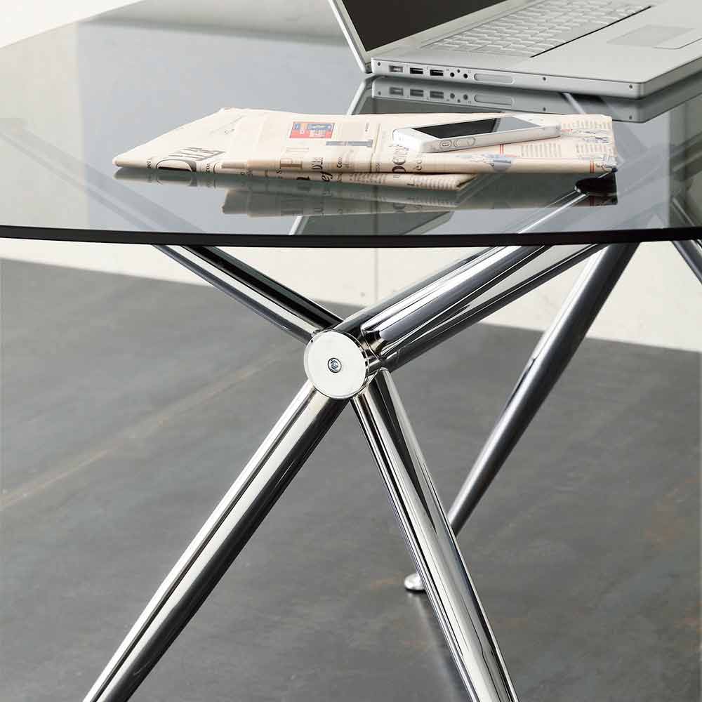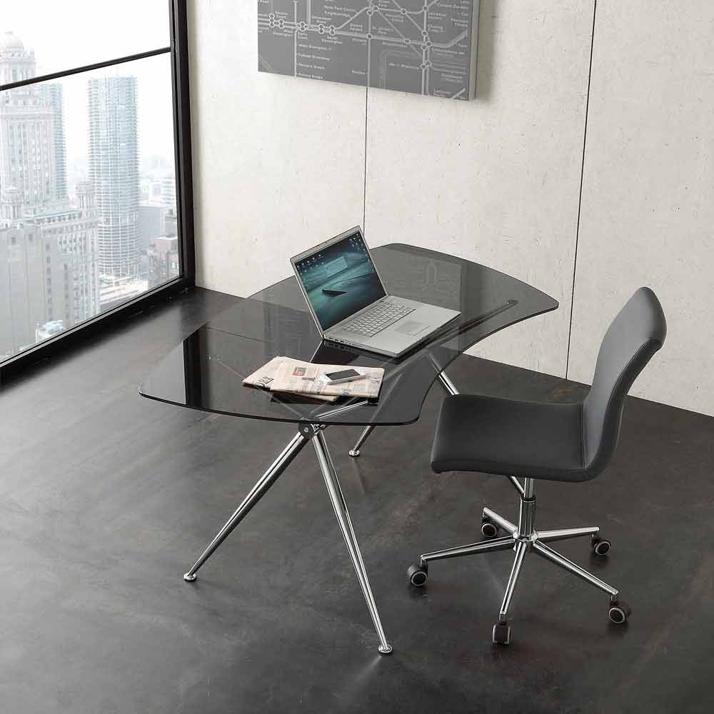 Kontorsskrivbord tillverkat i Italien med formad glasskiva (10 mm tjock) och metallstruktur i förkromad yta .