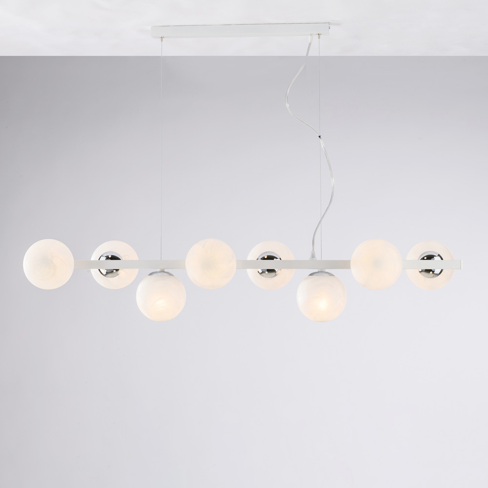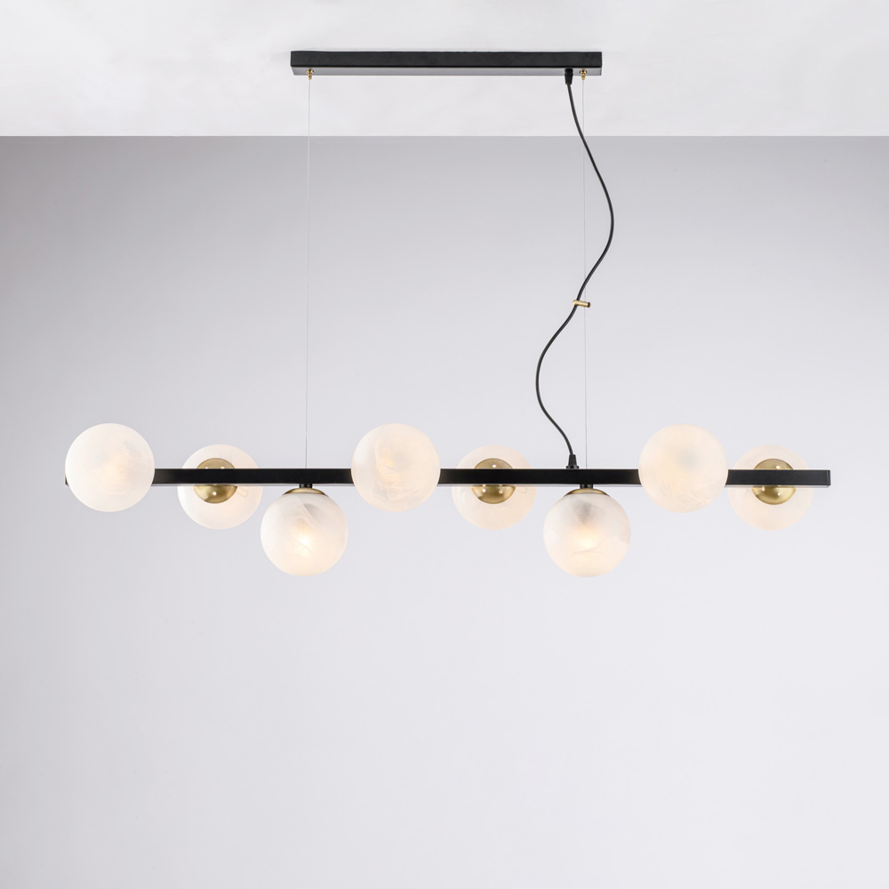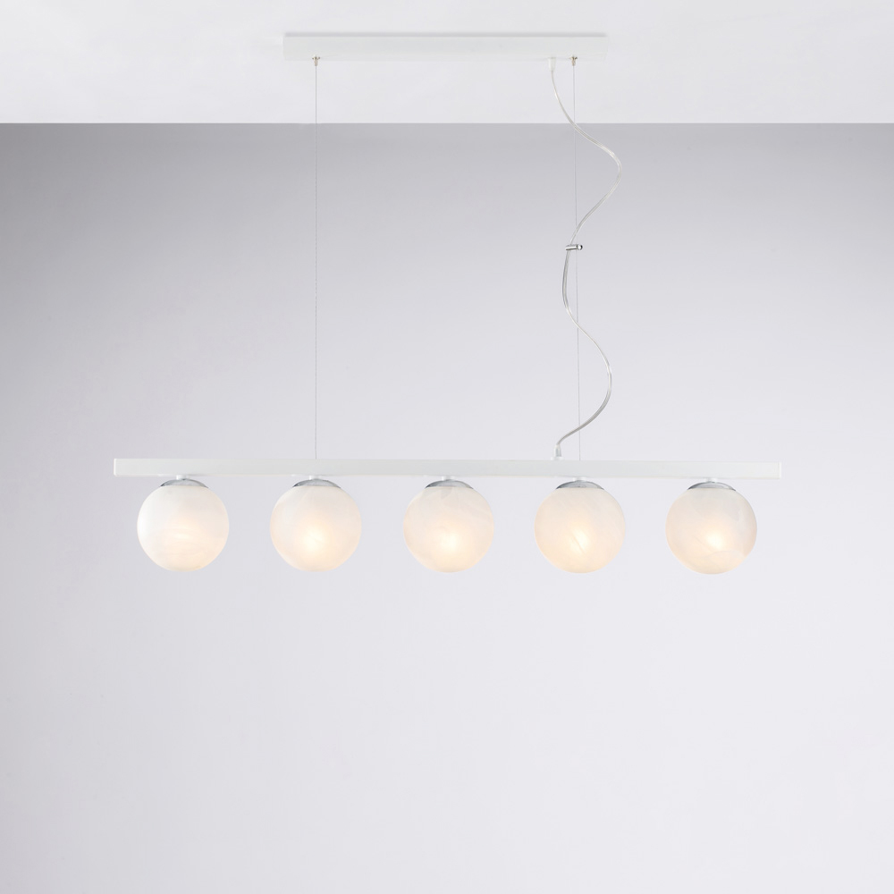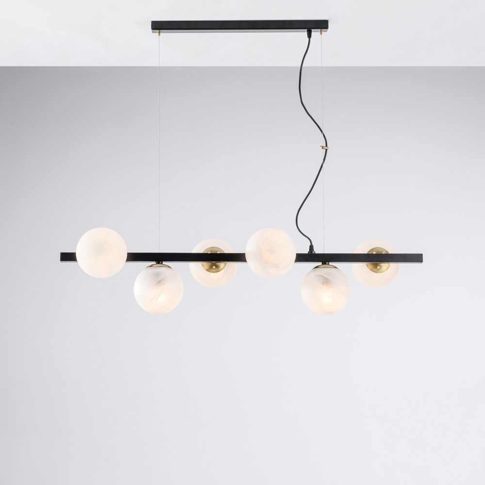 Modern, elegant och visuellt slående, denna handgjorda pendellampa i järn är designad för att förhöja moderna utrymmen med ett diffust, dramatiskt ljus. Den linjära strukturen, förstärkt av sekventiella lysande sfärer , skapar en perfekt balans mellan geometrisk stringens och visuell mjukhet.