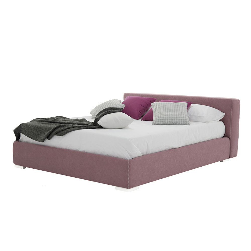 Lyxig låg dubbelsäng med förvaringslåda, handgjord i Italien i tyg eller eko-läder.