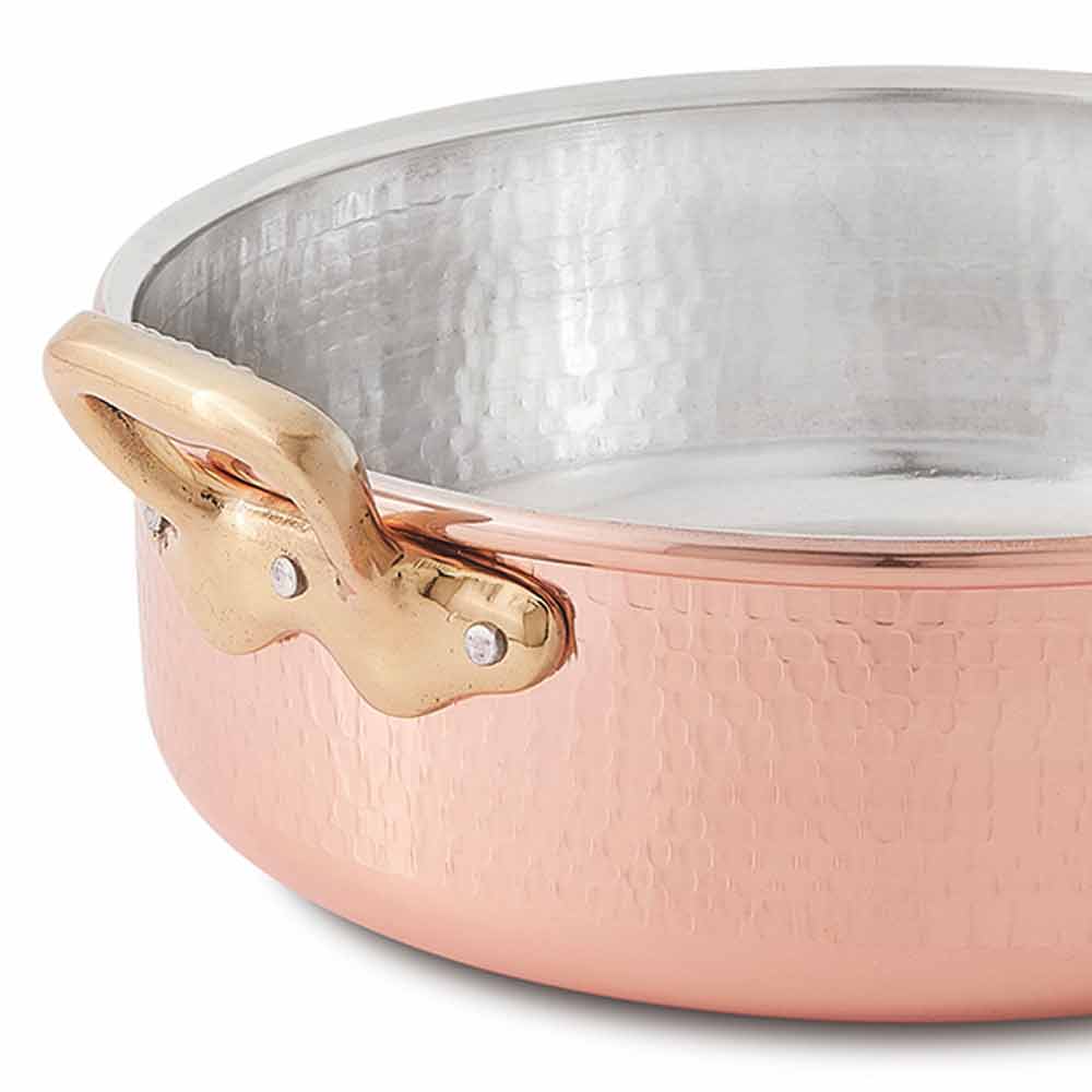 Låg gryta i handhamrad koppar med mässingshandtag, rund 24 cm tillverkad i Italien.