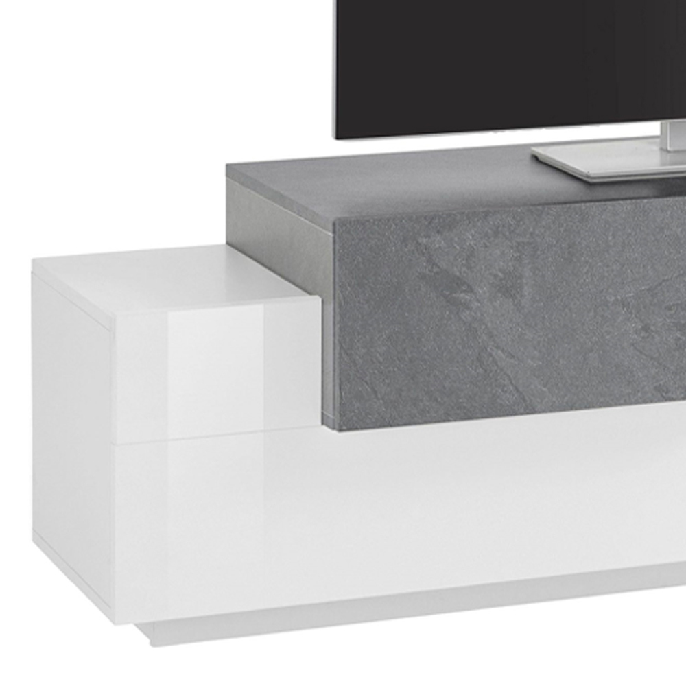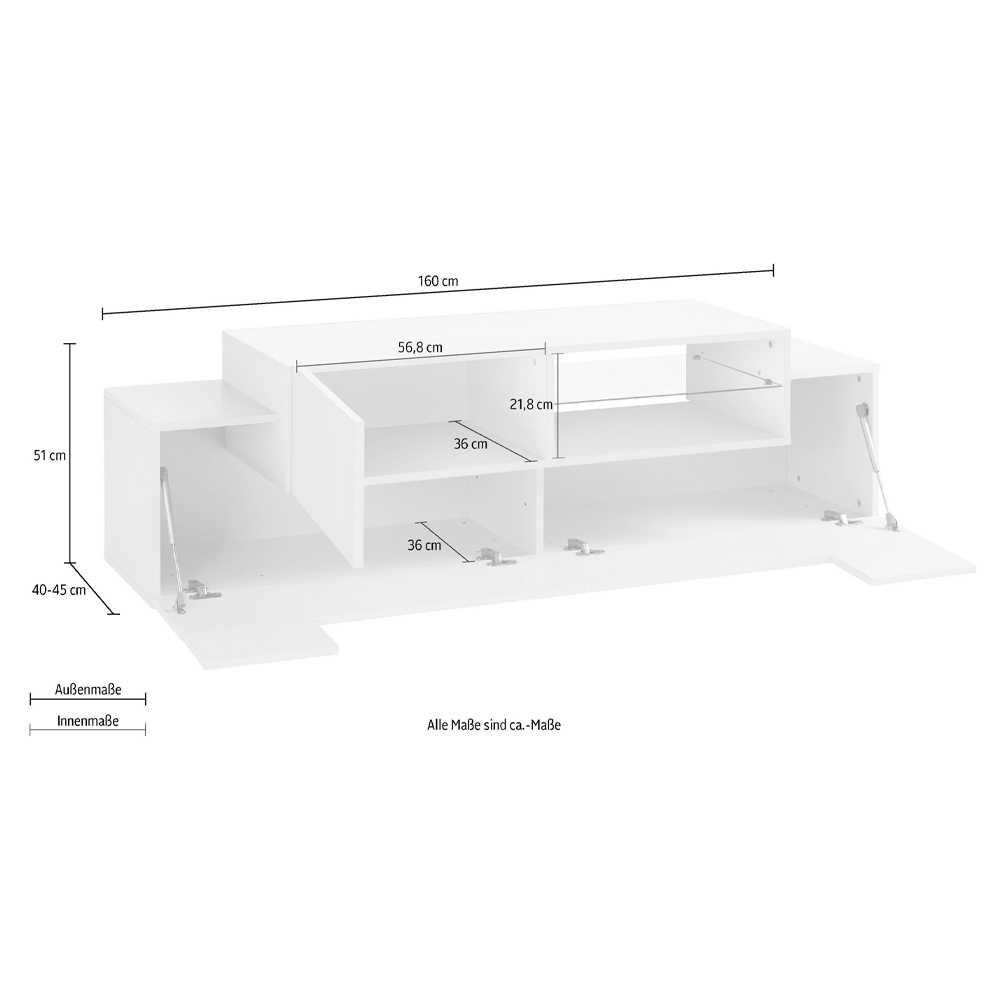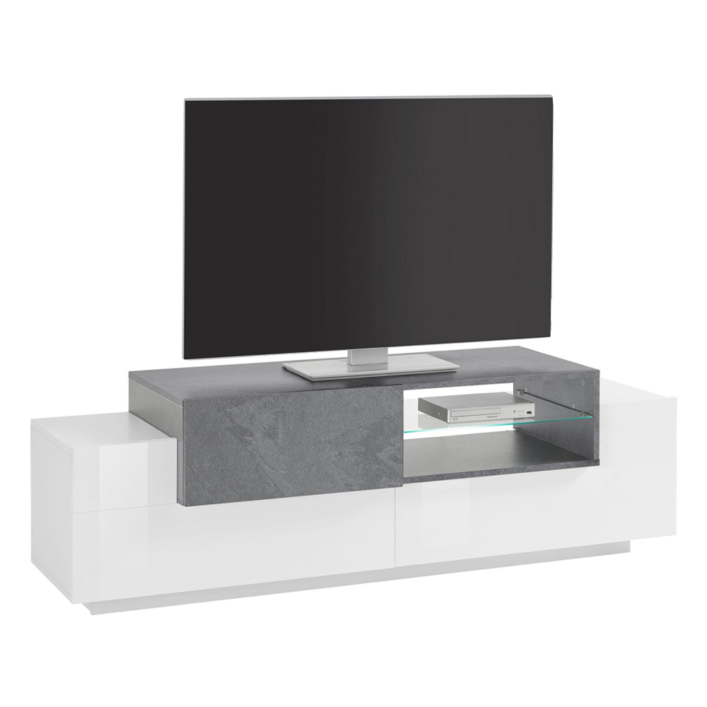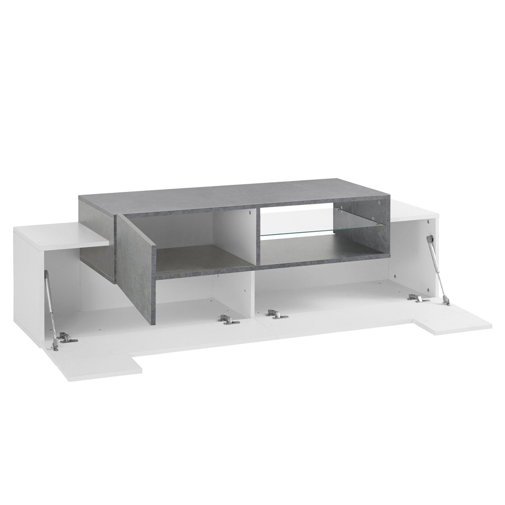 låga tv-skåpet för vardagsrummet består av 2 sidoluckor i blank vitlackerat trä och 1 gångjärnsdörr i melaminträ finns i två utföranden med ett centralt öppet fack med glashylla. Den på så sätt skapade designen presenterar en suggestiv och modern kontrast som ska placeras