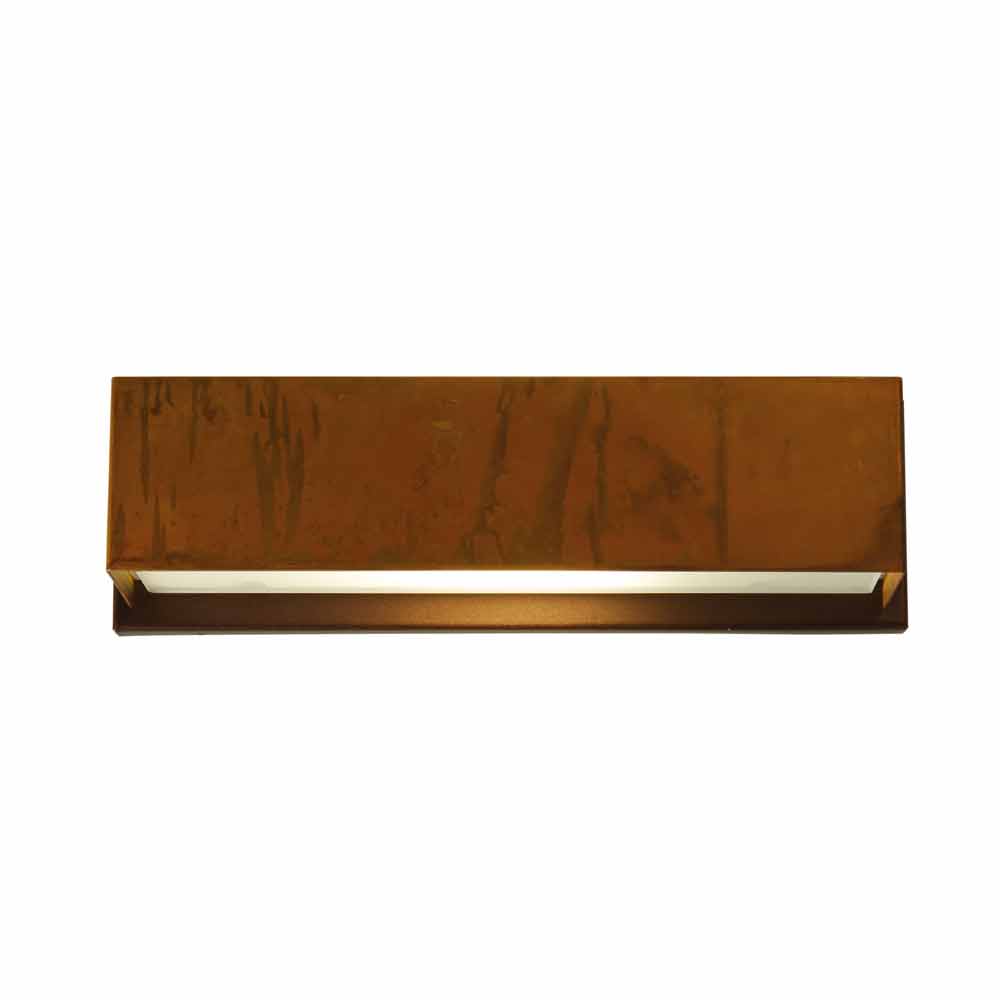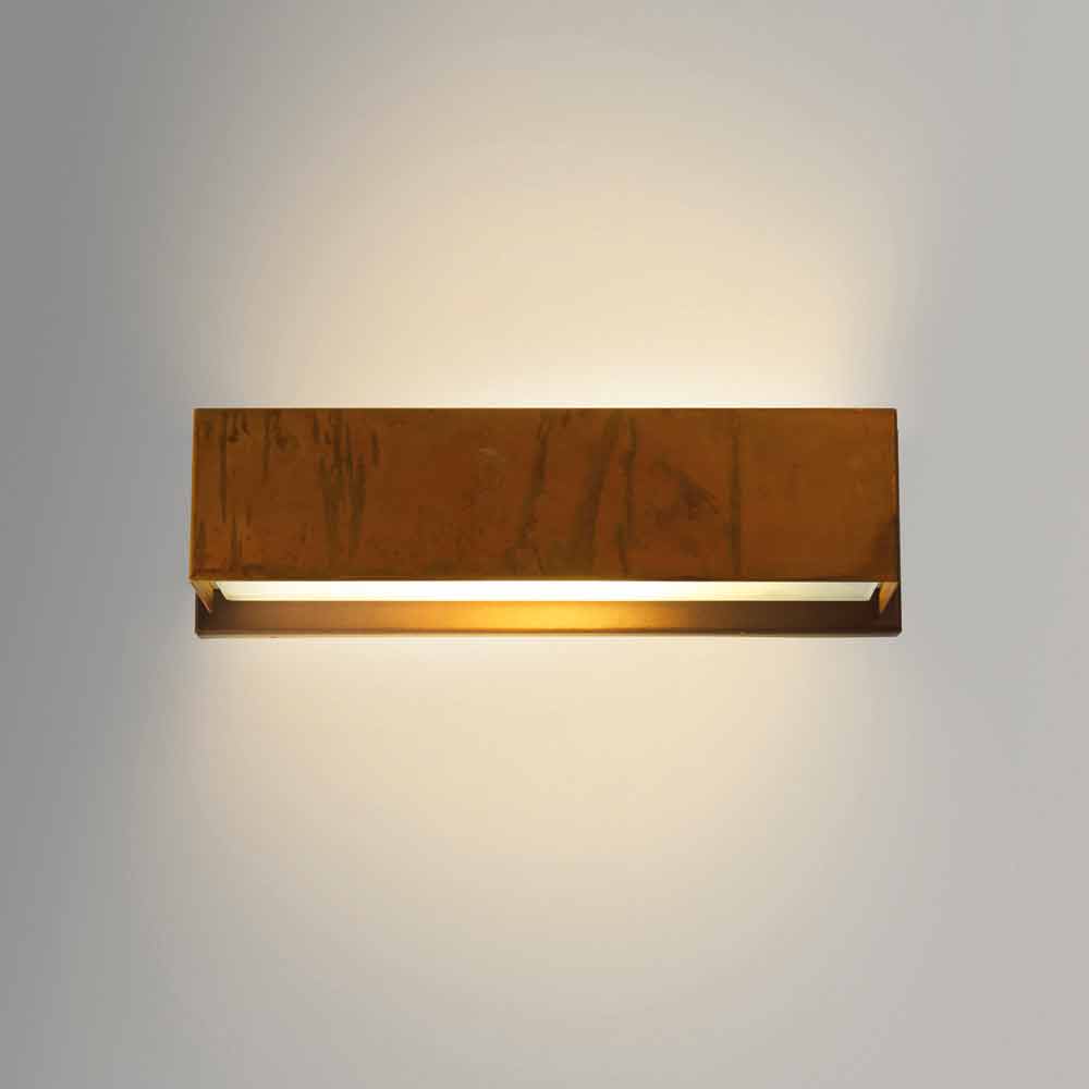 Vägglampa med mässingsstruktur oxiderad och sub-bas i pulverlackerat stål. Finns i två storlekar i kvadratisk eller rund form. Härdat glas diffusor för en ljusemission direkt och indirekt.