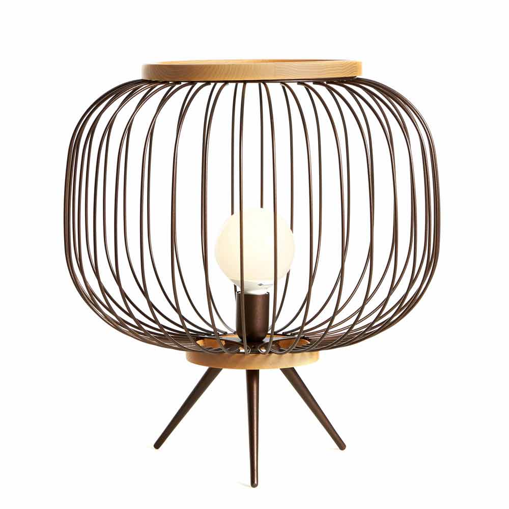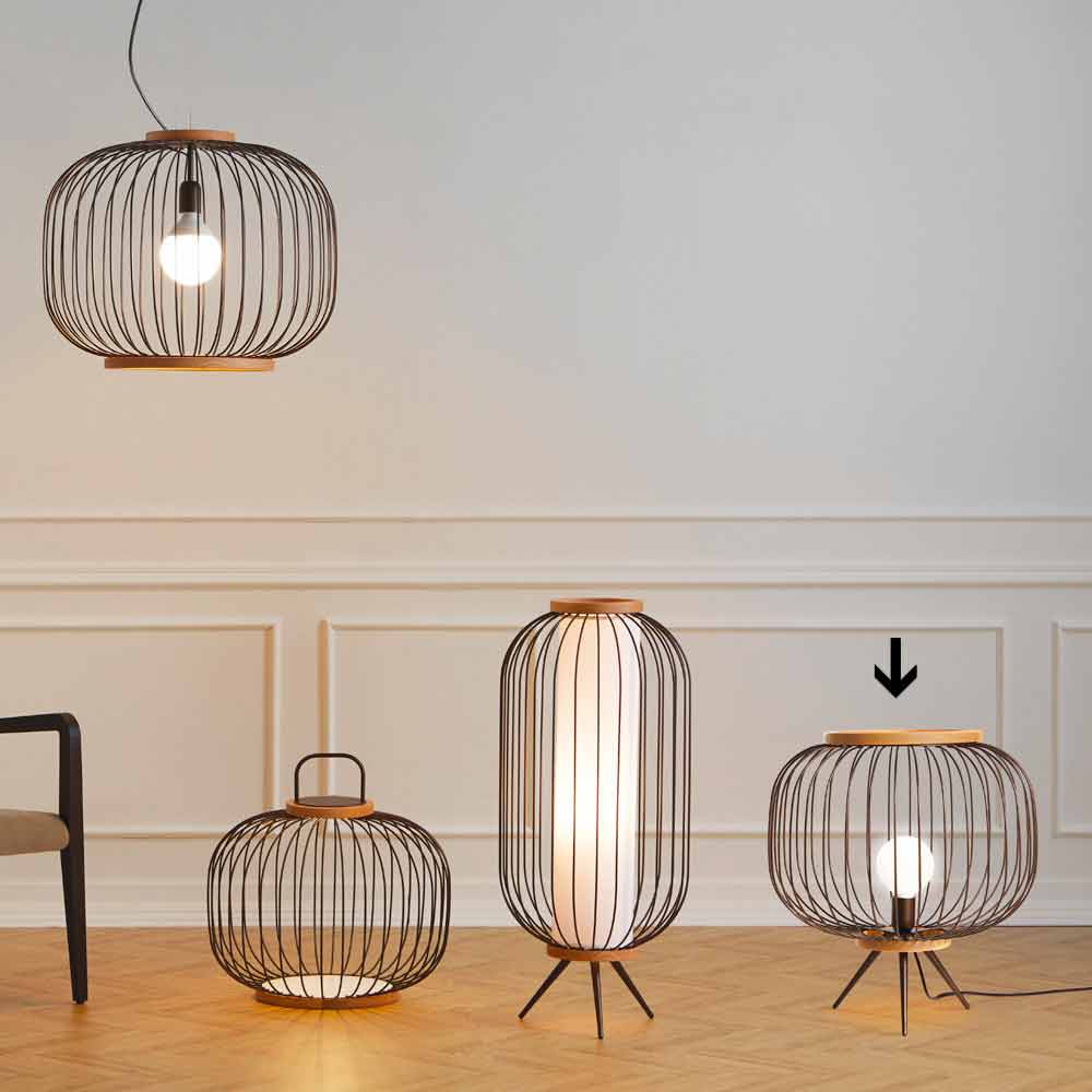 Golvlampa av bockad stålstång och målade med epoxi pulver. De två banden som stänger kroppen rundade trä. Mark versionerna kan också användas som svuotatasche antingen utan lampskärm. LED-ljuskällan av versionen med handtag är utrustat med ett laddningsbart batteri med en autonomi dicirca 6 timmar.