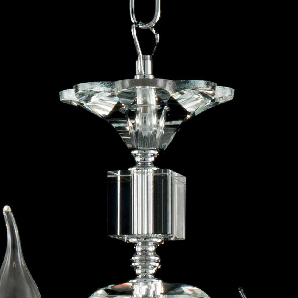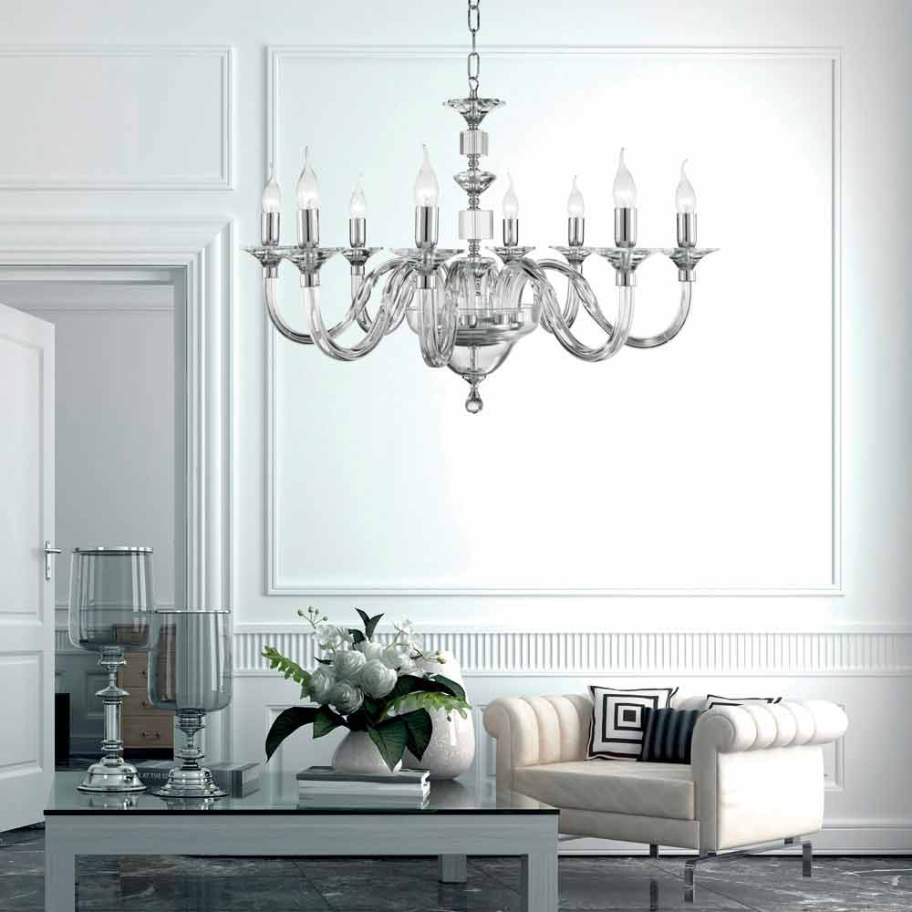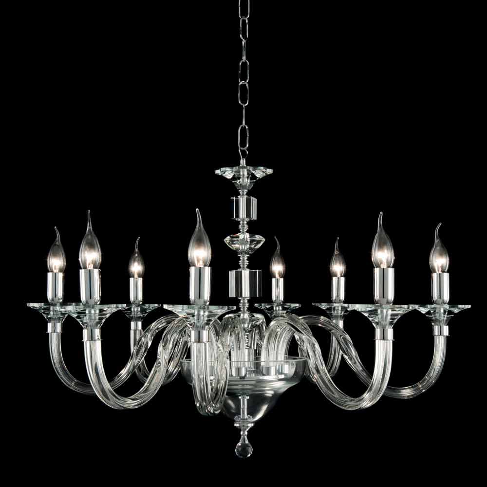 8-ljus ljuskrona i glas med murgrönakristalldekorationer Pendellampa tillverkad i Italien i handgjort transparent glas med kristalldekorationer. Kromad finish. Glödlampor: 8 x E14 40W Glödlampor ingår ej.