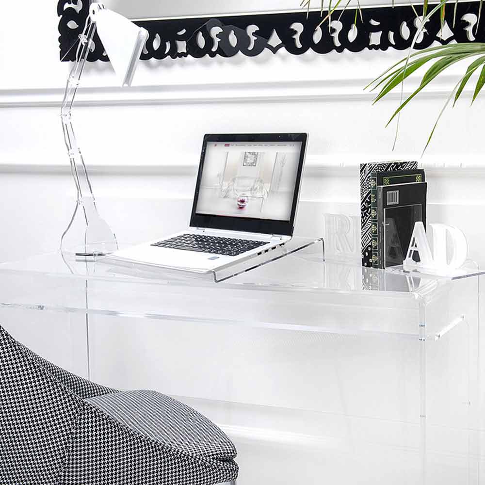 Tillverkad av transparent eller rökt plexiglas från 100% oskuldspolymer, det är den perfekta allierade för att arbeta hemifrån i komfort och kan presentera sig som en originalidé för julklappar för dem som vill ha ett praktiskt och funktionellt designkomplement . Materialet, beständigt och av hög kvalitet, garanterar en konstant ljusstyrka och glans över tiden.