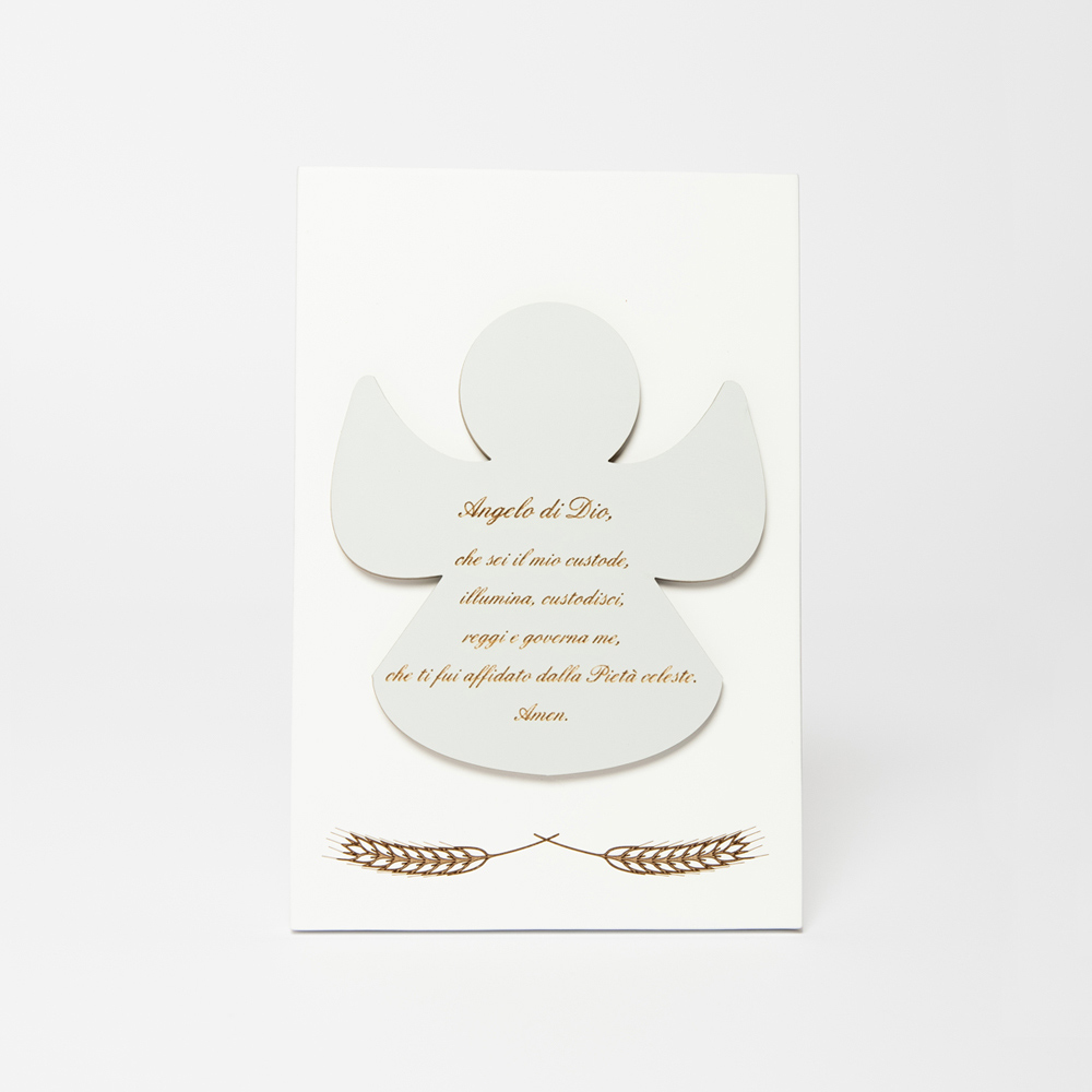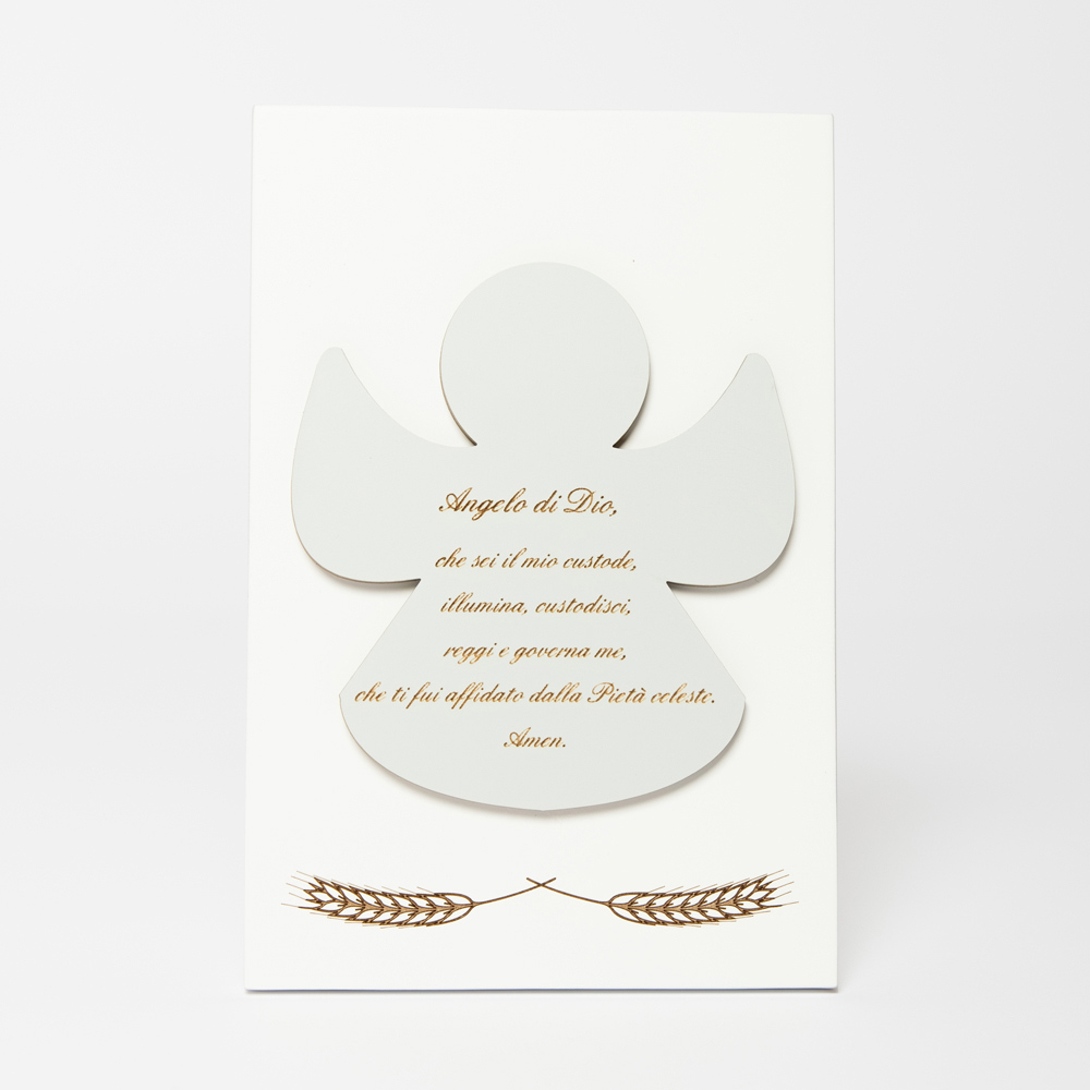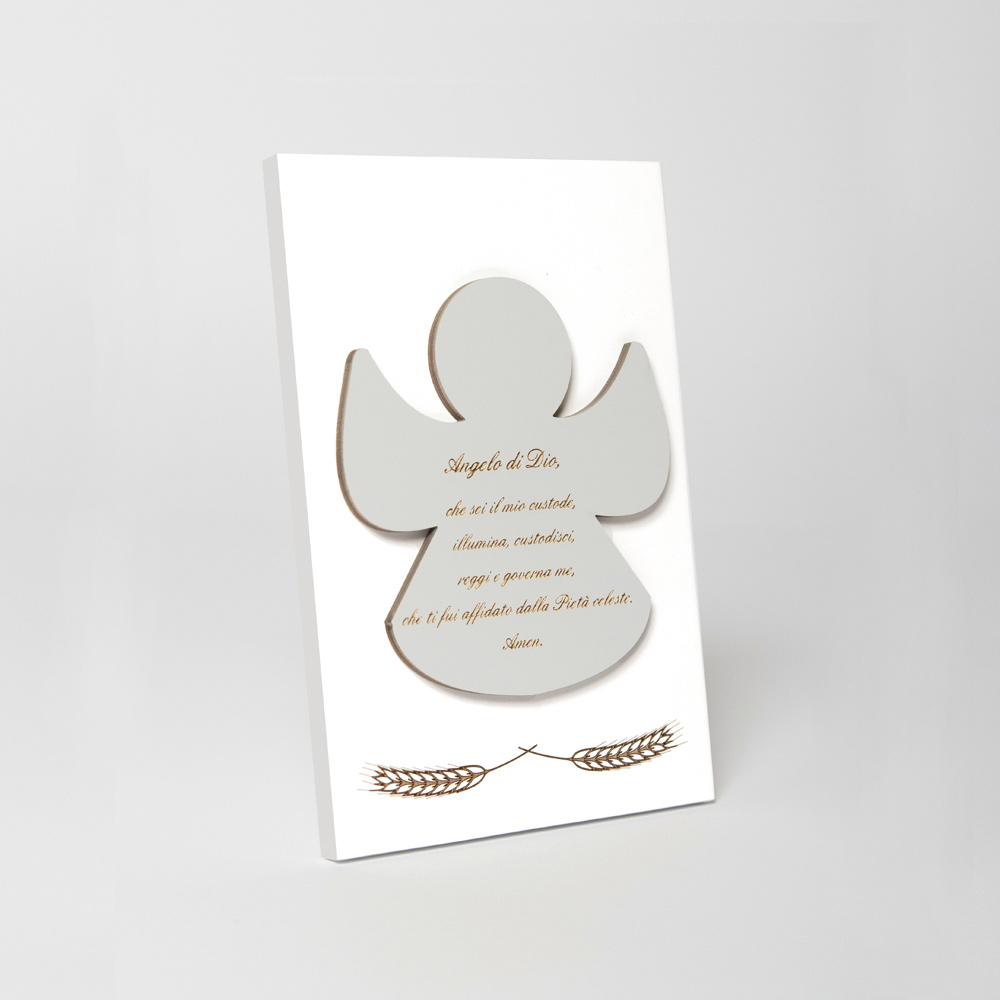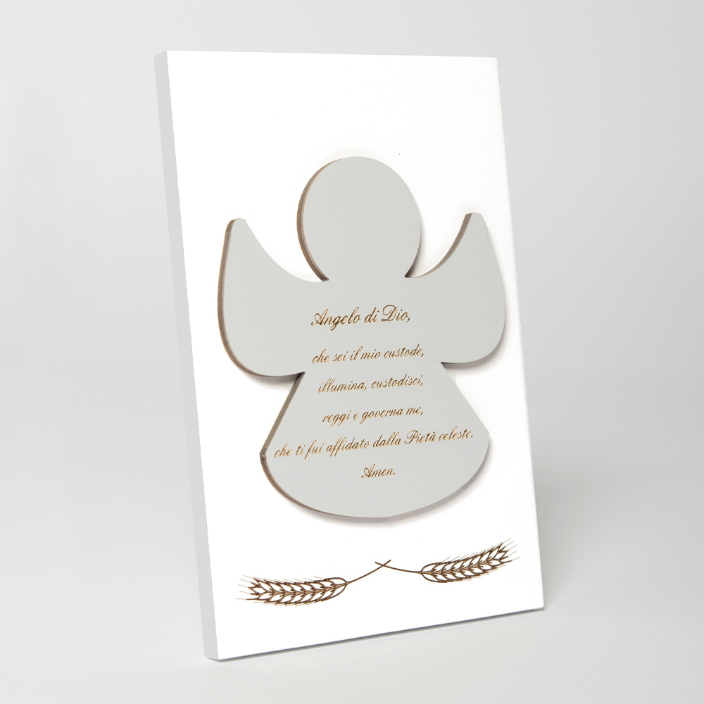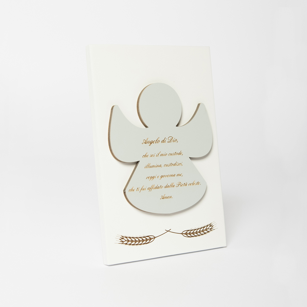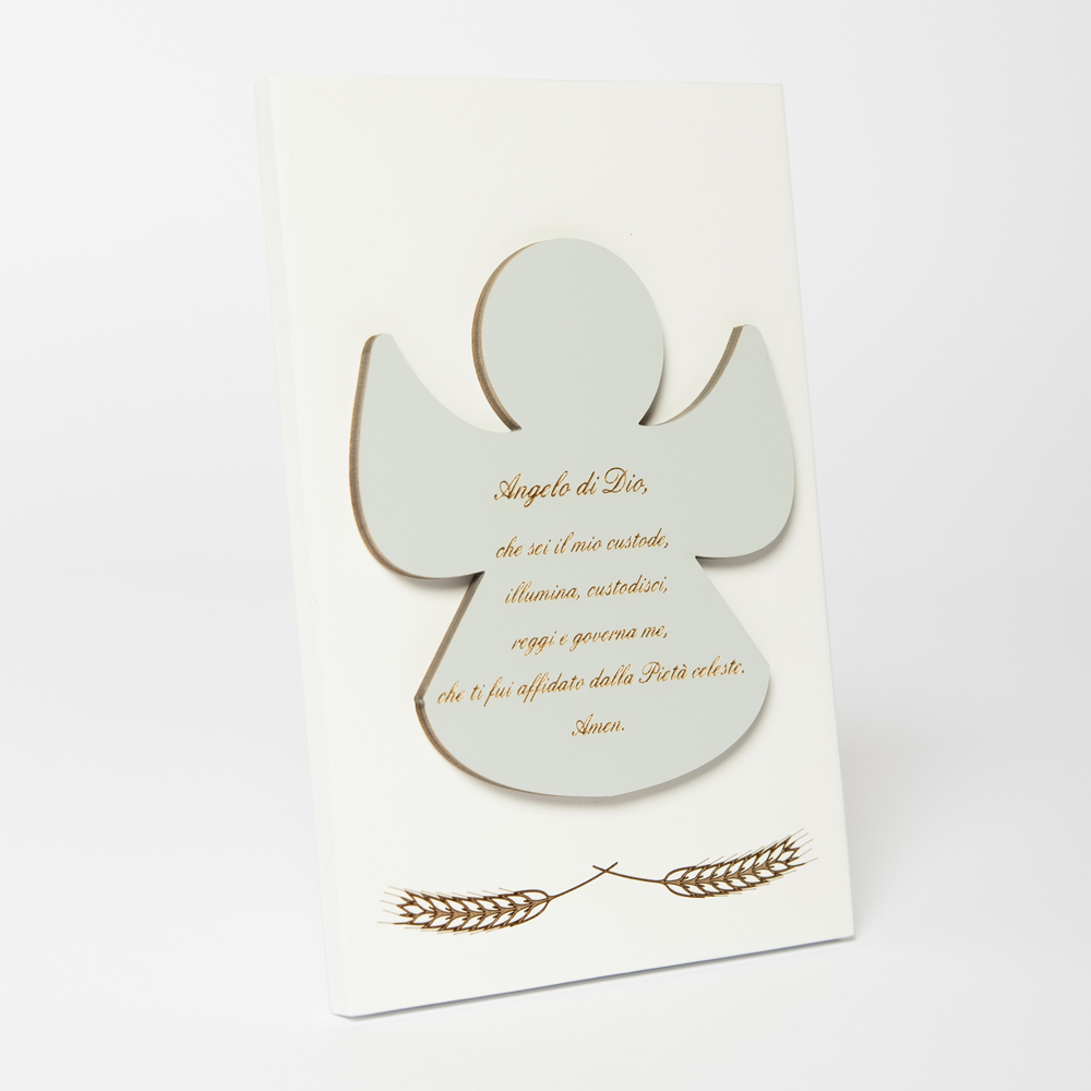 Helig bild med applicering av en ängel med graverad bön. Vitlackerad träpanel med stödfot. Applicering i dammigt grått.