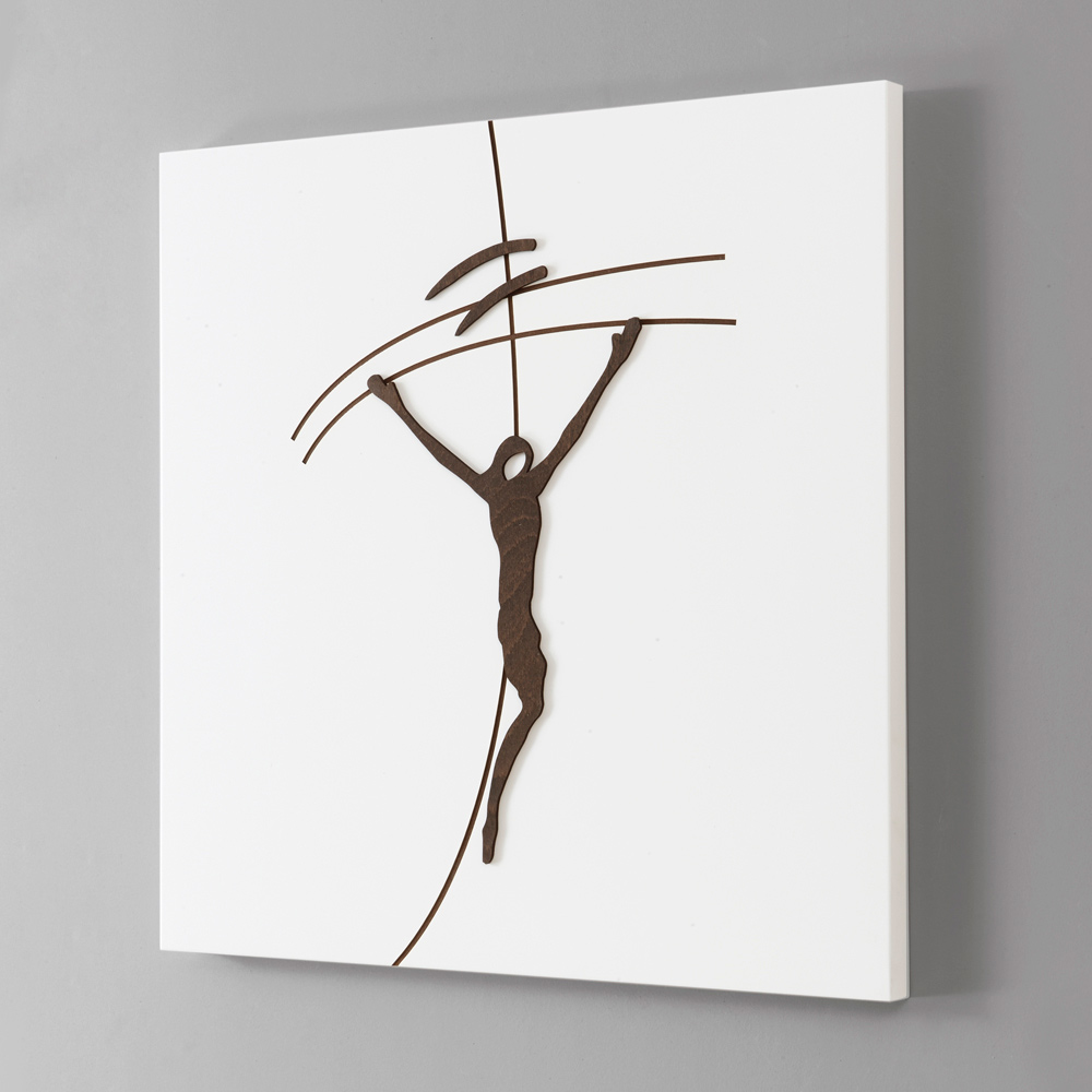Lackerad träbild med lasergravyr av det stiliserade korset och applicering av Jesus.