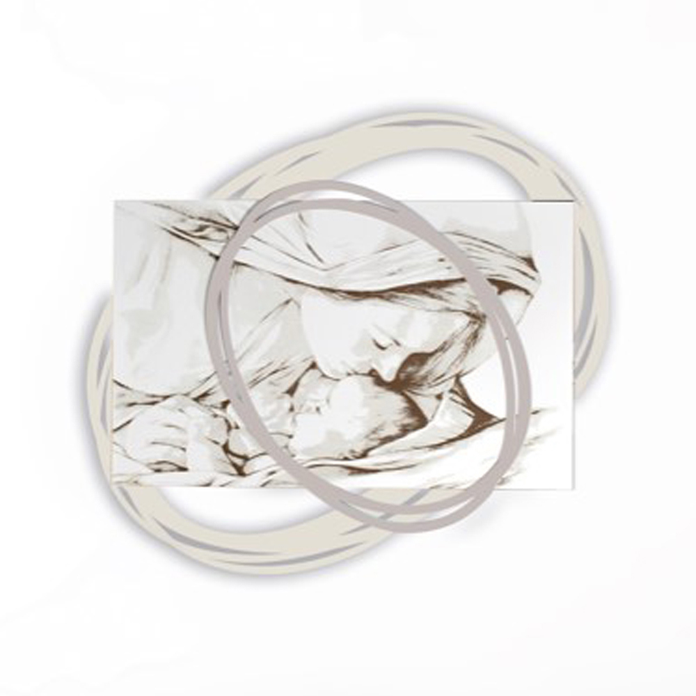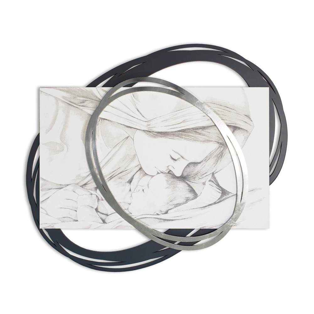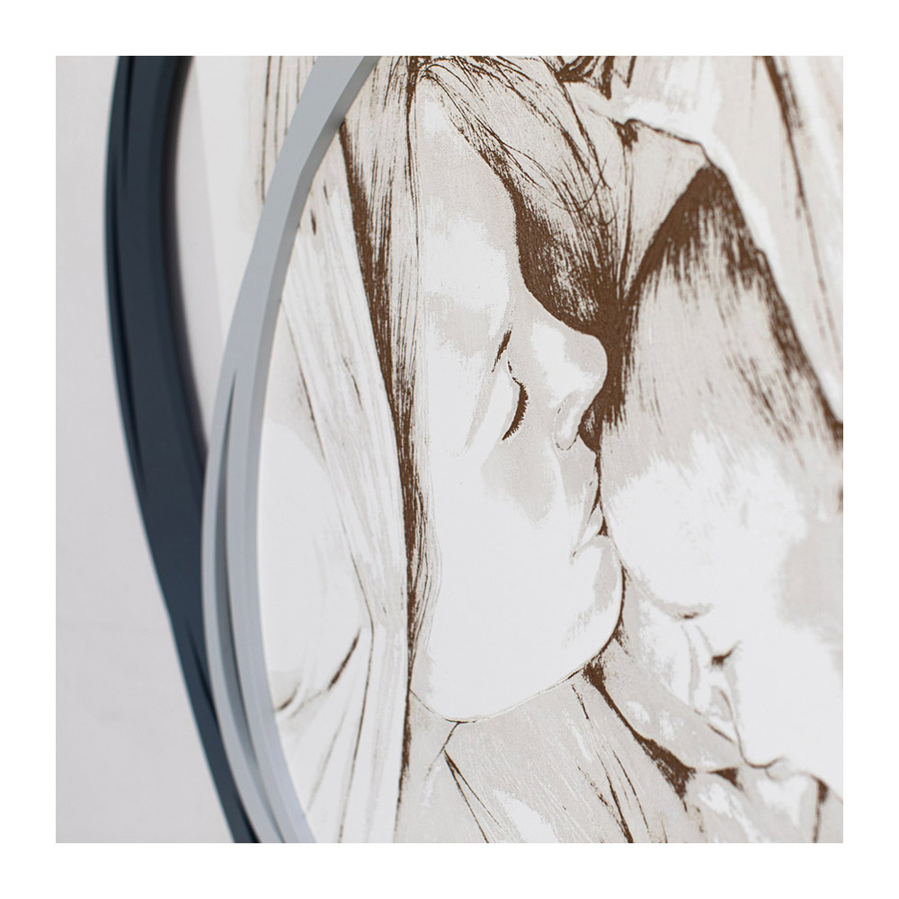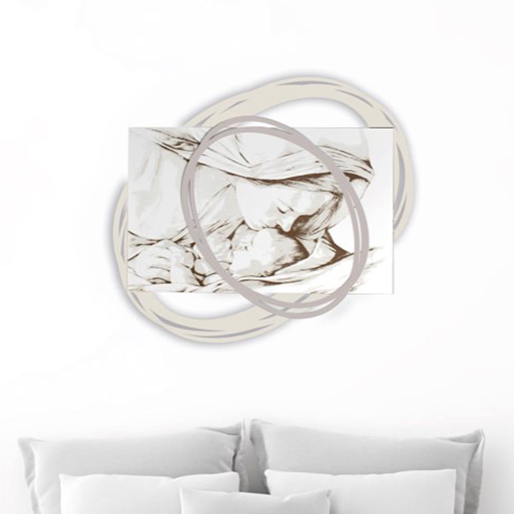 En sänggavel som visar en kyss från Madonnan till sin son tack vare lasermarkering, som visar ansiktens egenskaper. Matt vitlackerad träpanel med lasermärkning, en speciell teknik som skapar en basrelief på materialen.