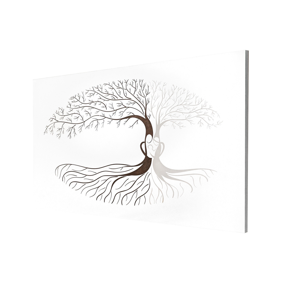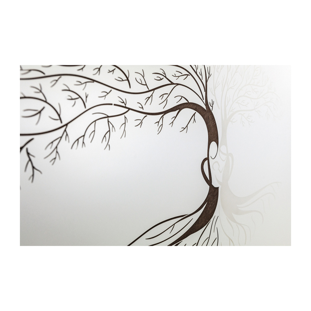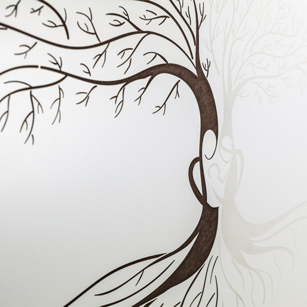 Grenar och löv gjorda med lasermärkning förgrenar sig från stammen. Stomme i matt vitlackerat trä med applikationer i lackat trä i två nyanser och lasermärkning.
