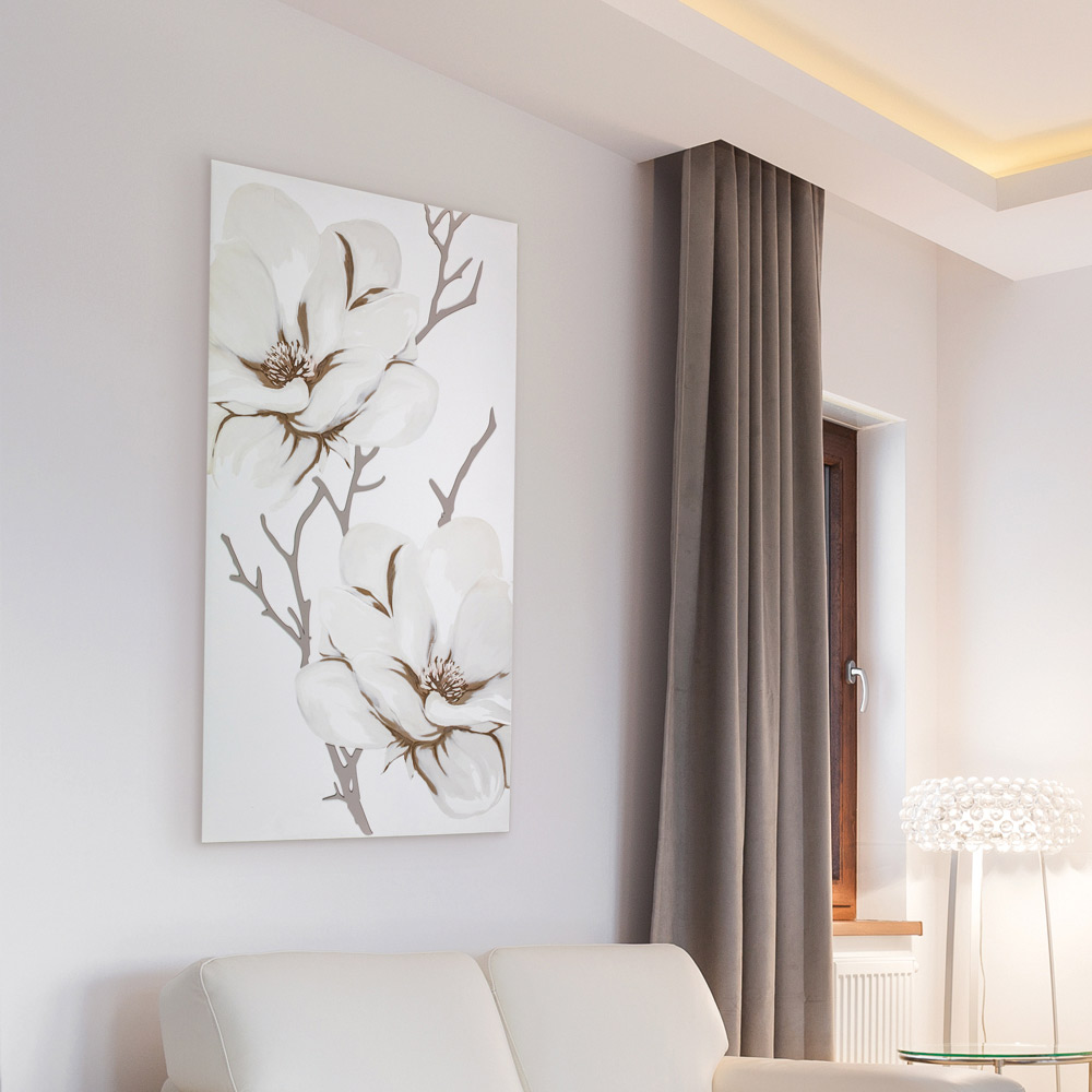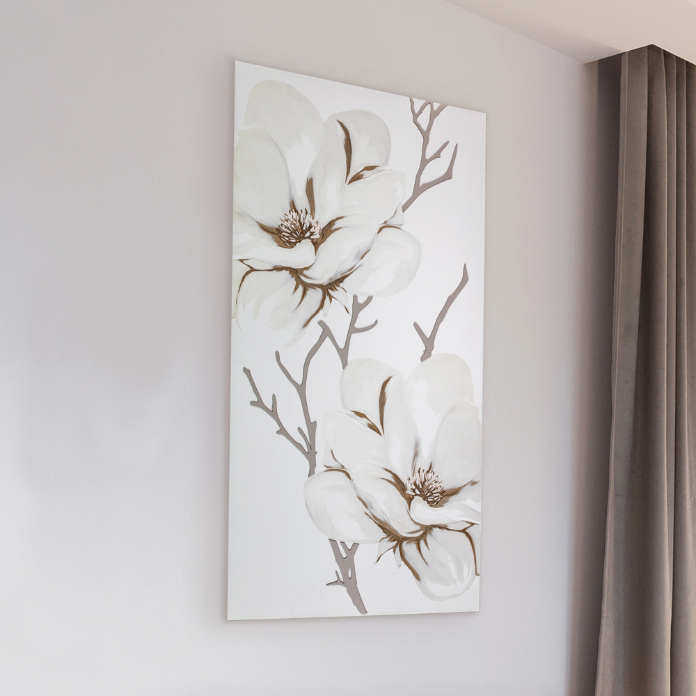 Panelen med dekoration är gjord med lasermarkeringsteknik som skapar en basrelief på materialet, vilket skapar olika färggraderingar av kronbladen som skapas på panelen. Magnoliapanelen är gjord av matt vitlackerat trä med stenfärgade applikationer. En elegant möbel med två fina Magnoliablommor, graverade i detalj med laser med stenfärgade dekorationer.