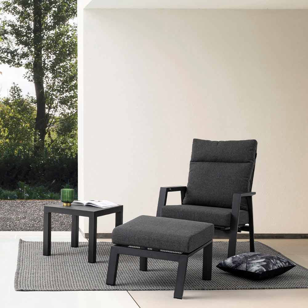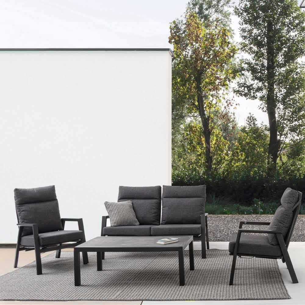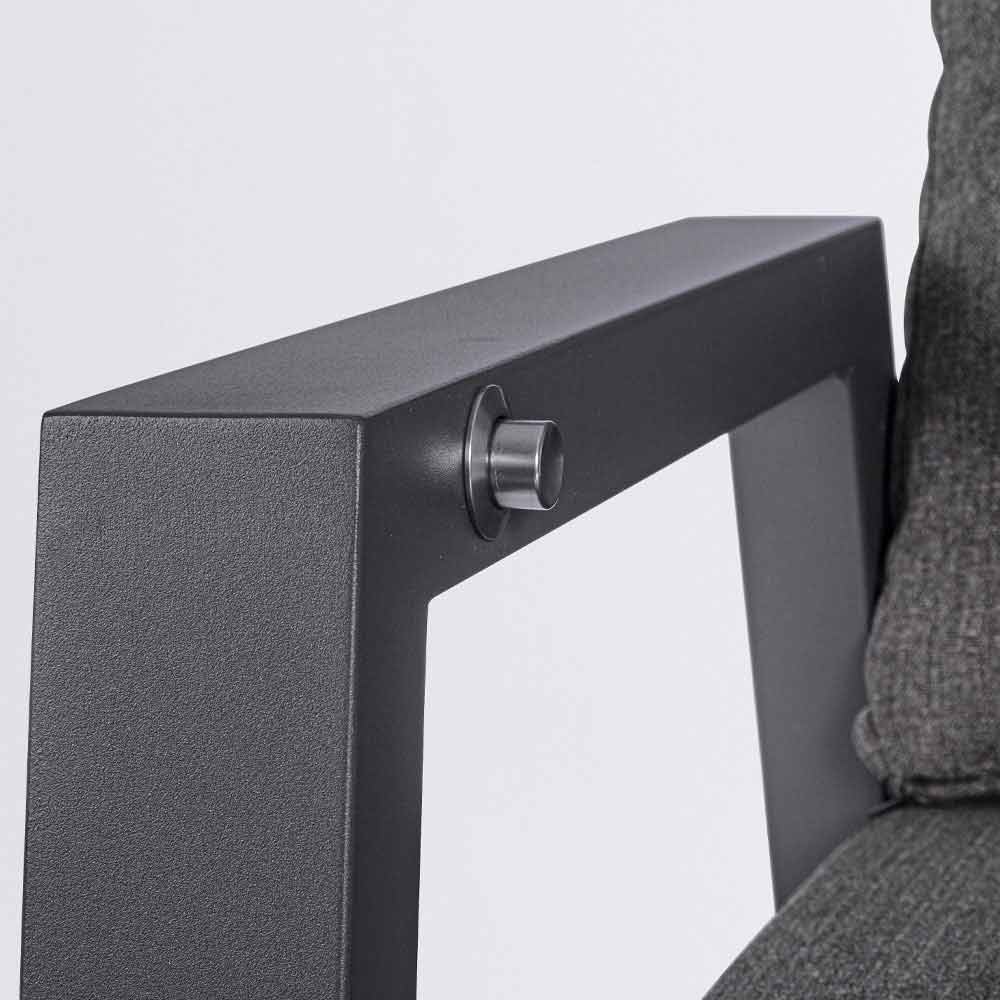 Pulverlackerad aluminiumstruktur (polyester). Lutande ryggstöd i fritt läge och säte i 1x1 textilene. Avtagbara kuddar med olefintyg (100% polypropen).