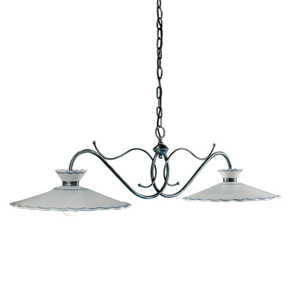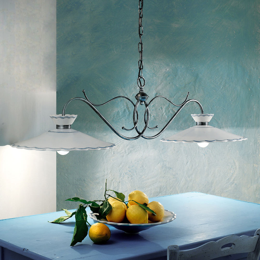 Handgjord 2-ljus hänglampa i metall och keramik med broderieffekt, 2 storlekar tillverkad i Italien av Ferroluce.