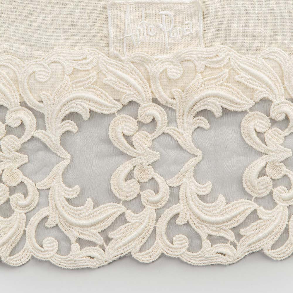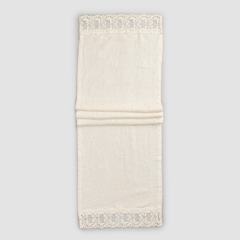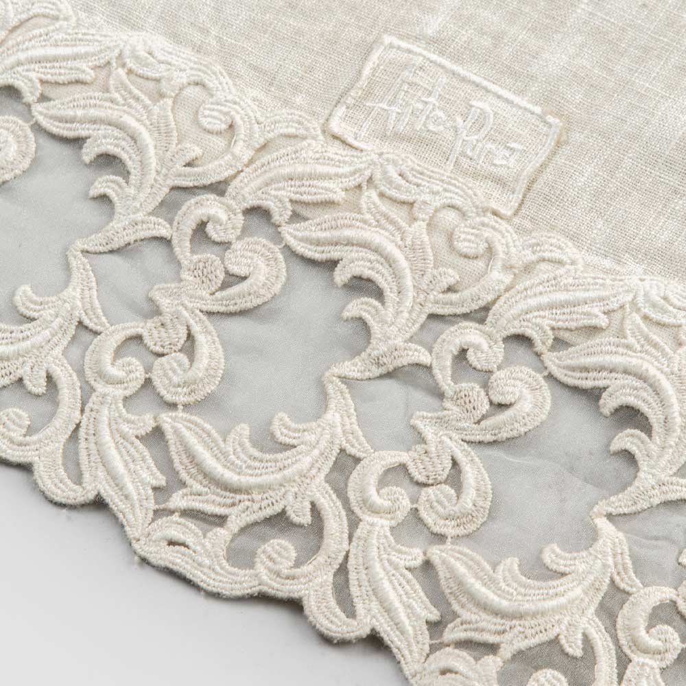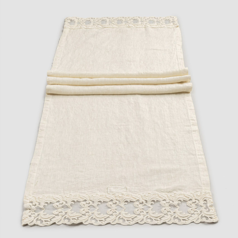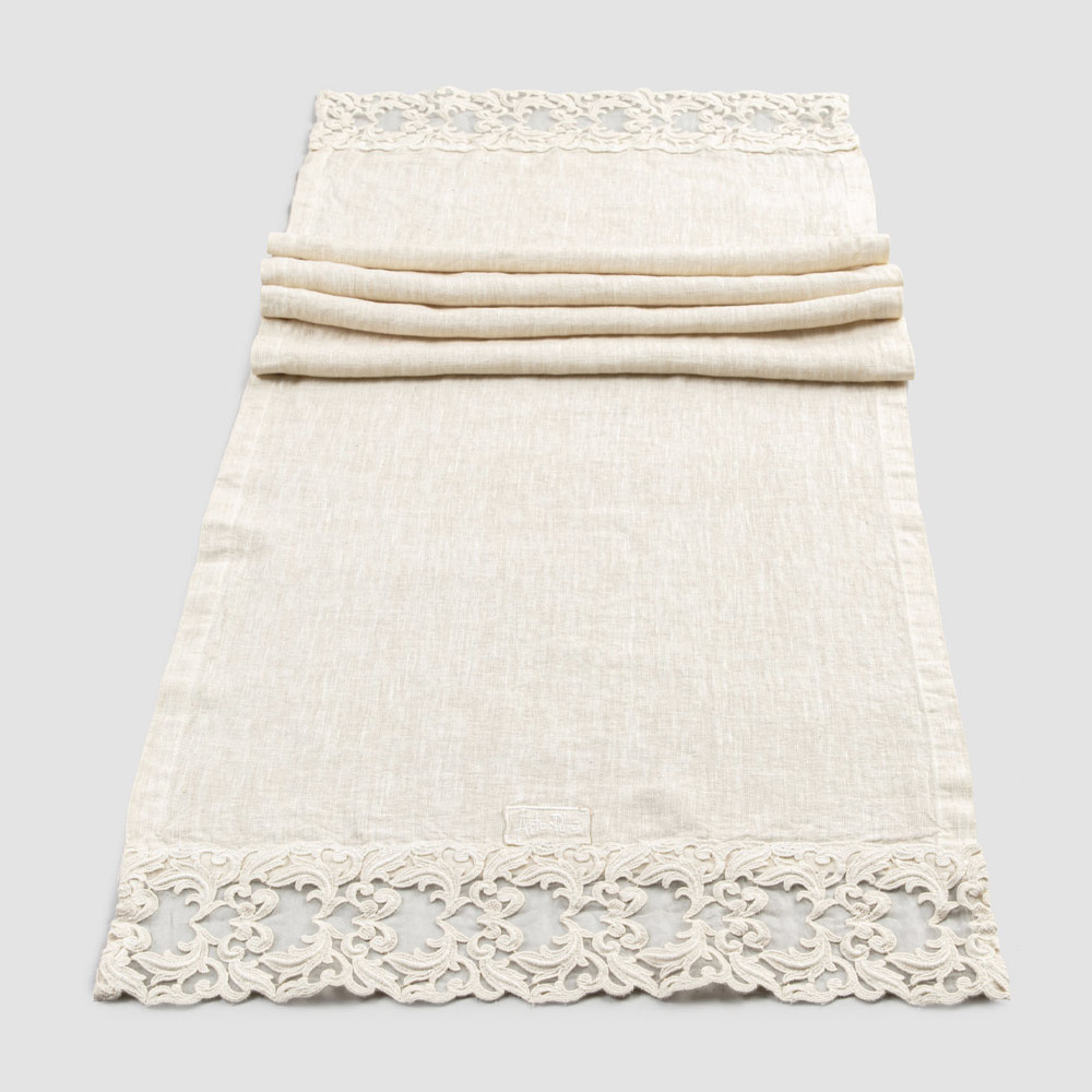 Kraftig bordslöpare med spets och vikad kant, lyx tillverkad i Italien.
