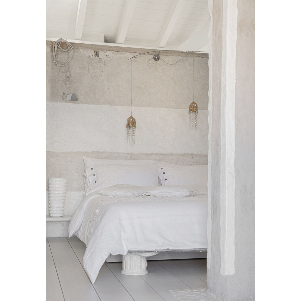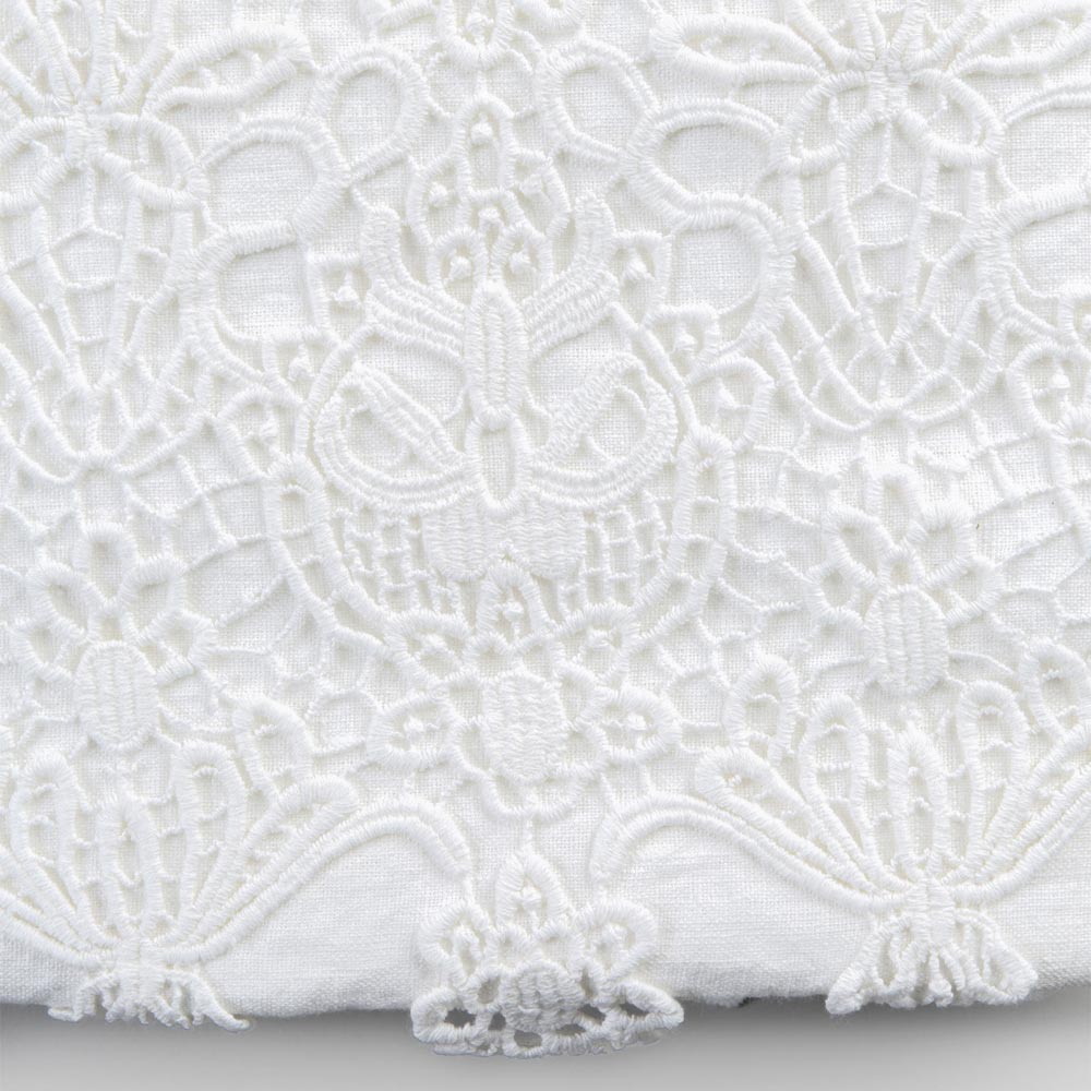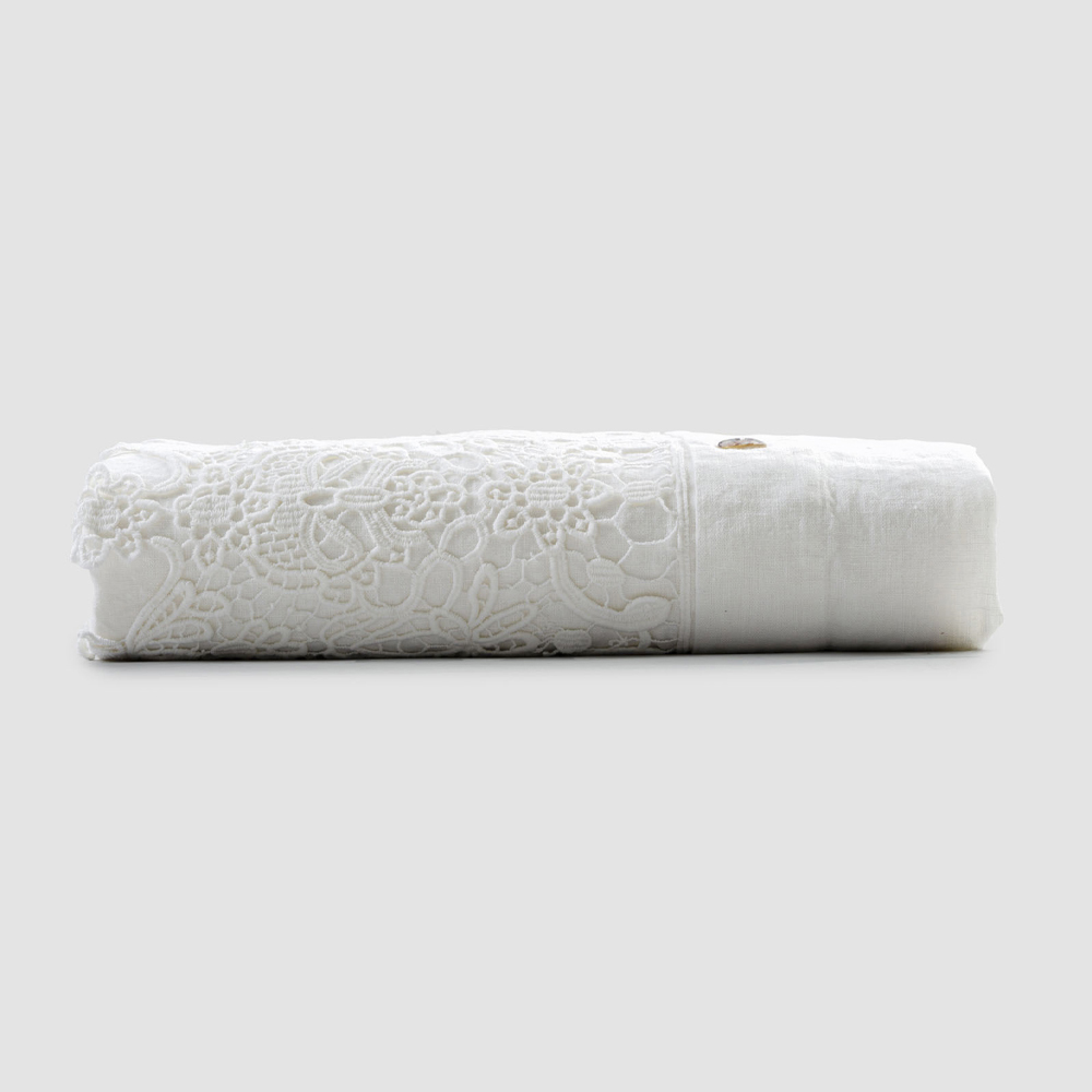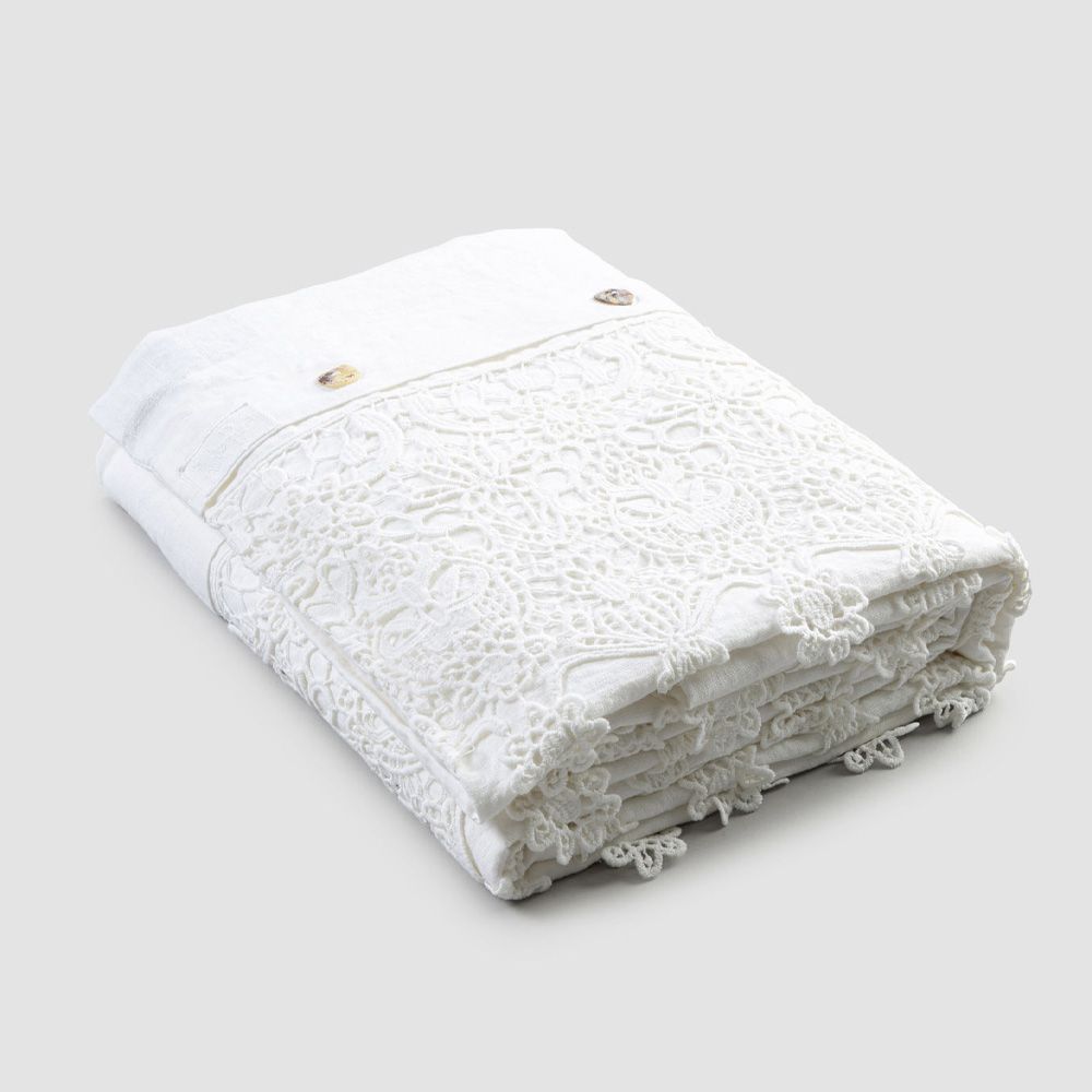 Dubbel påslakan i vitt linne med spetsdroppar, handgjord lyxdesign tillverkad i Italien.