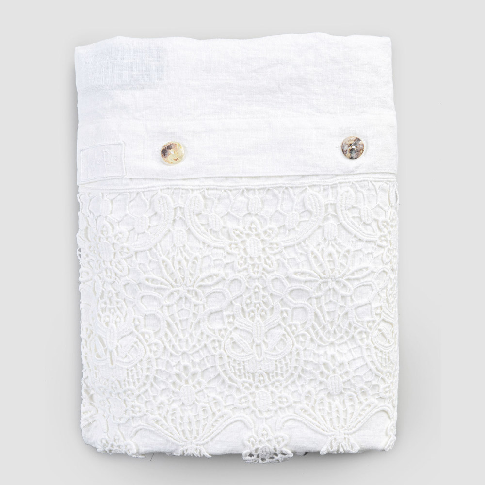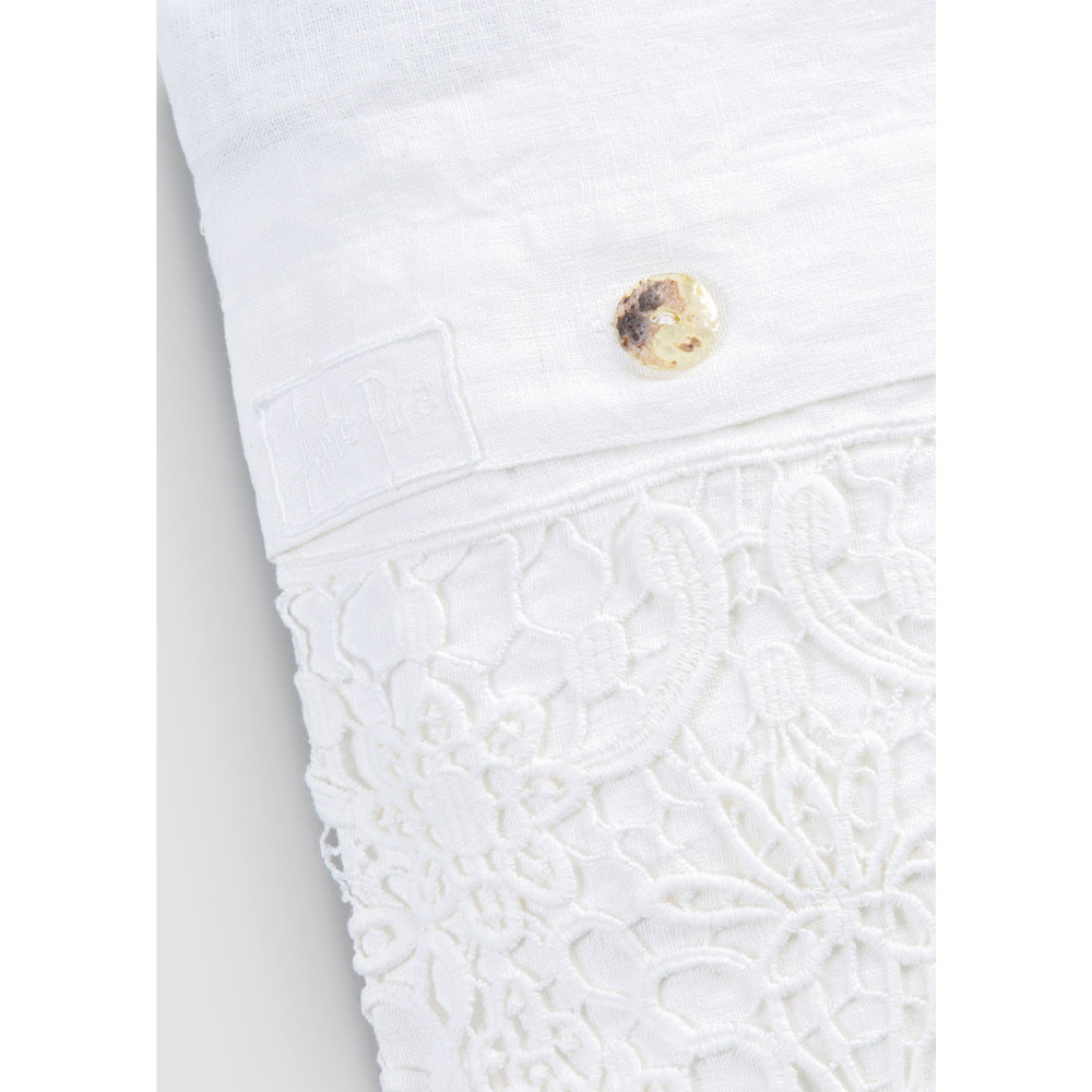 Värdet av tradition ansluter sig till den moderna livsstilen med denna tunga vita linnebehållarsäck utsmyckad med droppspets och Agoyas pärlemorsknappar.
