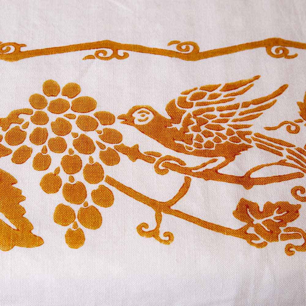 - Handtryck : stor skicklighet för denna fas som sker för hand med träformar där designen graverades för hand. Färgen sprids på dynan där formen doppas, vilken sedan placeras på tyget och med en tung trähaller slås den över formen för att imponera på designen på tyget.