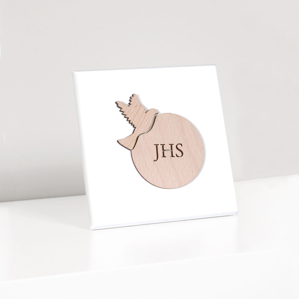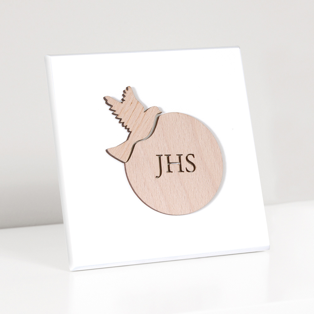 Helig bild med värd och konfirmationsduva i naturligt trä applicerad. Vitlackerad träpanel med stödfot och hål för att hänga upp den på väggen.