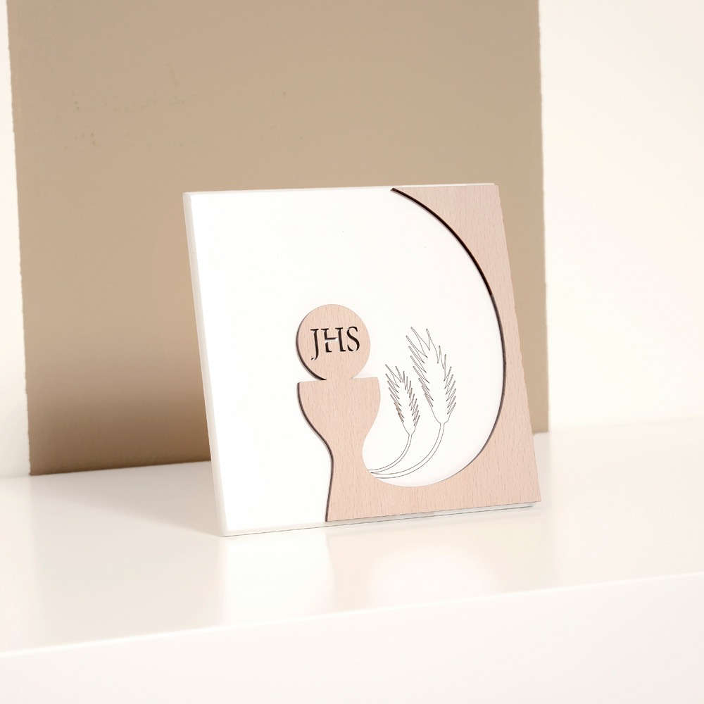De italienska hantverkarna har arbetat hårt för att skapa enkla och linjära ytbehandlingar som vill lyfta fram symbolerna för nattvarden, kalken och rånet med veteax. Så föddes en enkel men visuellt slående produkt som kan ges som gåva eller representera ett minne av ett speciellt ögonblick.