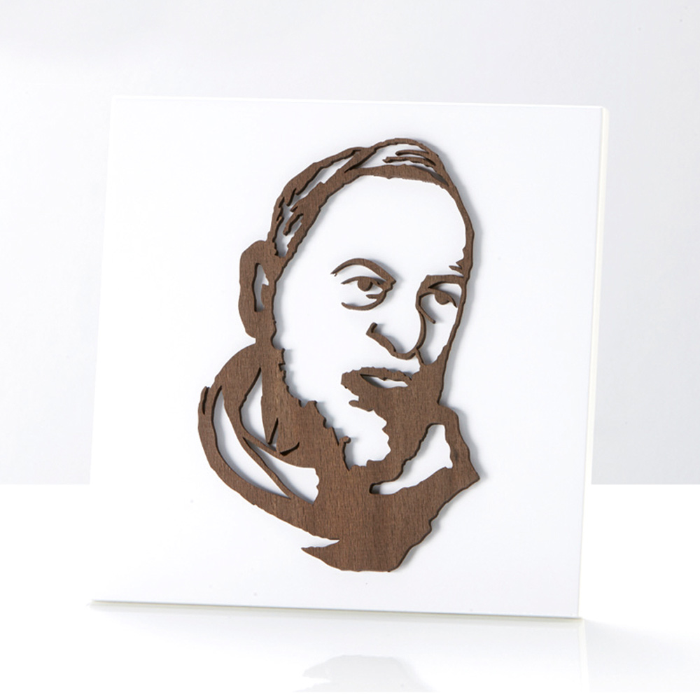 Helig bild med Padre Pio i wengéträ applicerad. Vitlackerad träpanel med stödfot och hål för att hänga upp den på väggen.