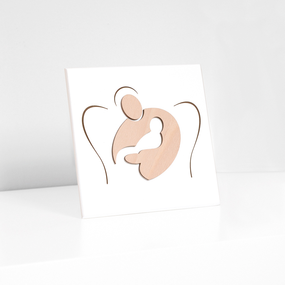 Helig bild med naturligt träapplikation av en mamma som kramar ett barn och lasergravyr. Vitlackerad träpanel med stödfot och hål för att hänga upp den på väggen.