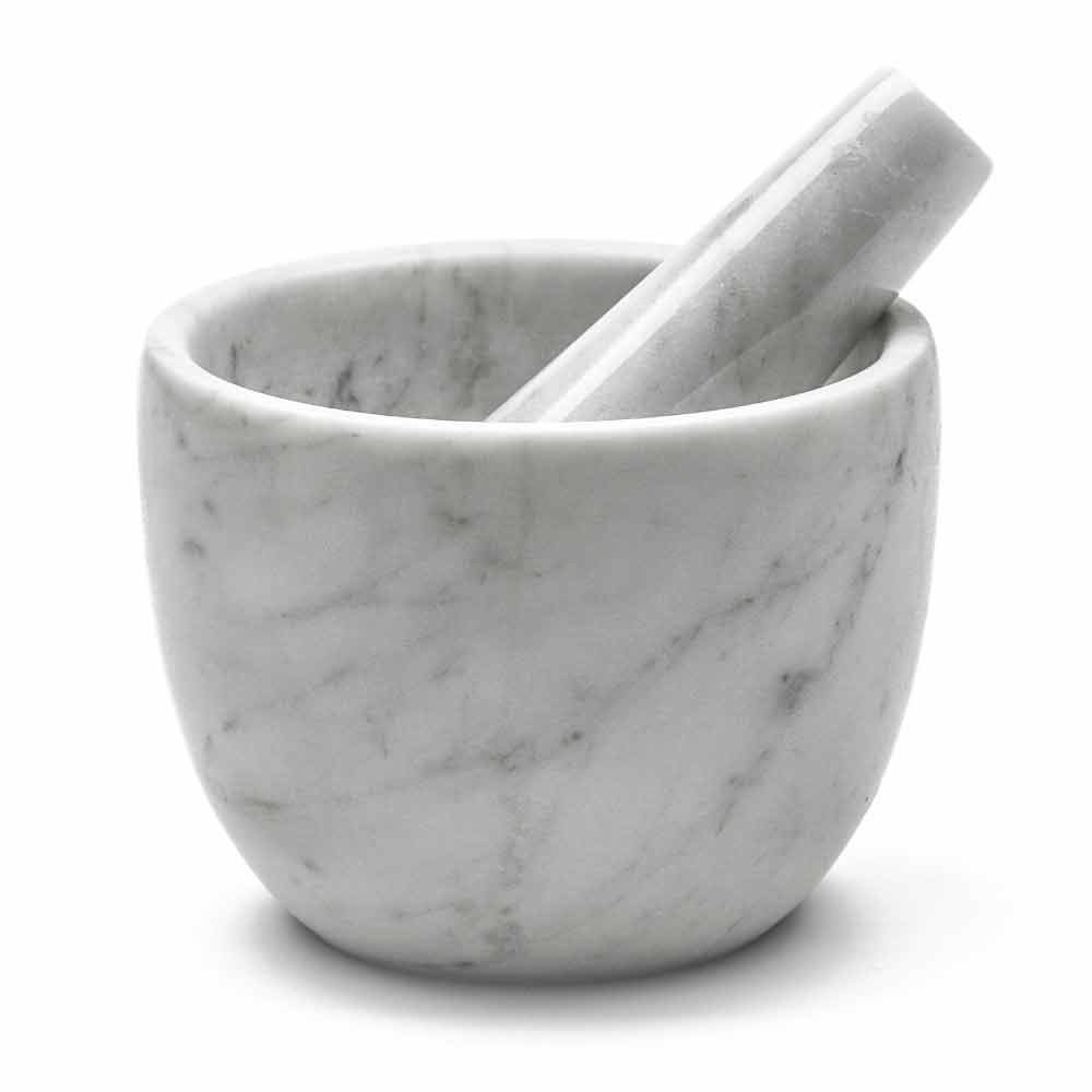 Liten mortel med mortelstöt helt gjord av högkvalitativ vit Carrara-marmor . Det är en unik bit eftersom varje block av marmor skiljer sig från de andra för vener och nyanser.