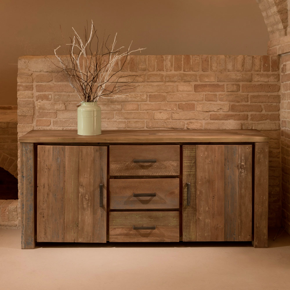 Inomhusskänk av återvunnet trä med Pandora-finish med 2 luckor och 3 centrala lådor .
