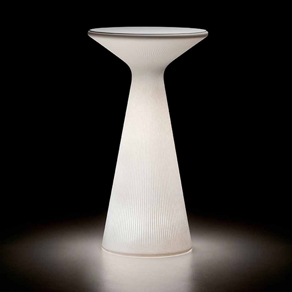 Runt utomhus soffbord tillverkat i Italien med polyetenstruktur och vit HPL-topp. Enkelhet och funktionalitet utmärker detta moderna höga bord som är idealiskt för att användas som en praktisk stödyta men samtidigt kan spela en rent dekorativ roll tack vare dess innovativa och originella design. Den speciella randiga ytan som täcker hela produktens bas gör soffbordets estetik intressant, berikad av RGB LED-ljuset som lyser upp strukturen och ger liv åt idealiska atmosfärer för att tillbringa underbara kvällar i sällskap i inhemska utrymmen som trädgårdar och terrasser men också i kontraktsmiljöer där det är nödvändigt att hitta en inredningslösning som är lika funktionell som den är estetiskt tilltalande.