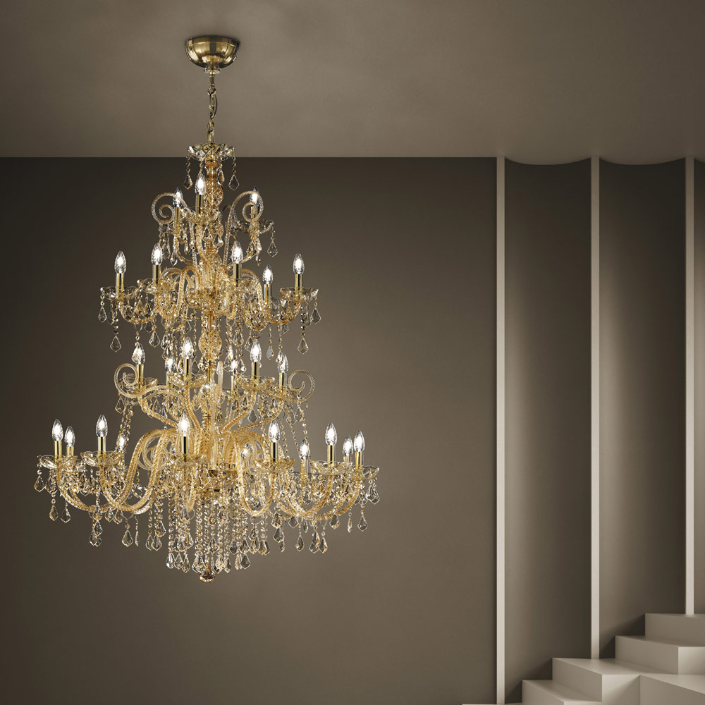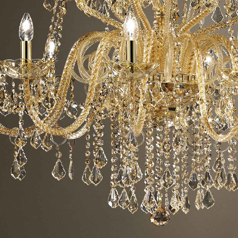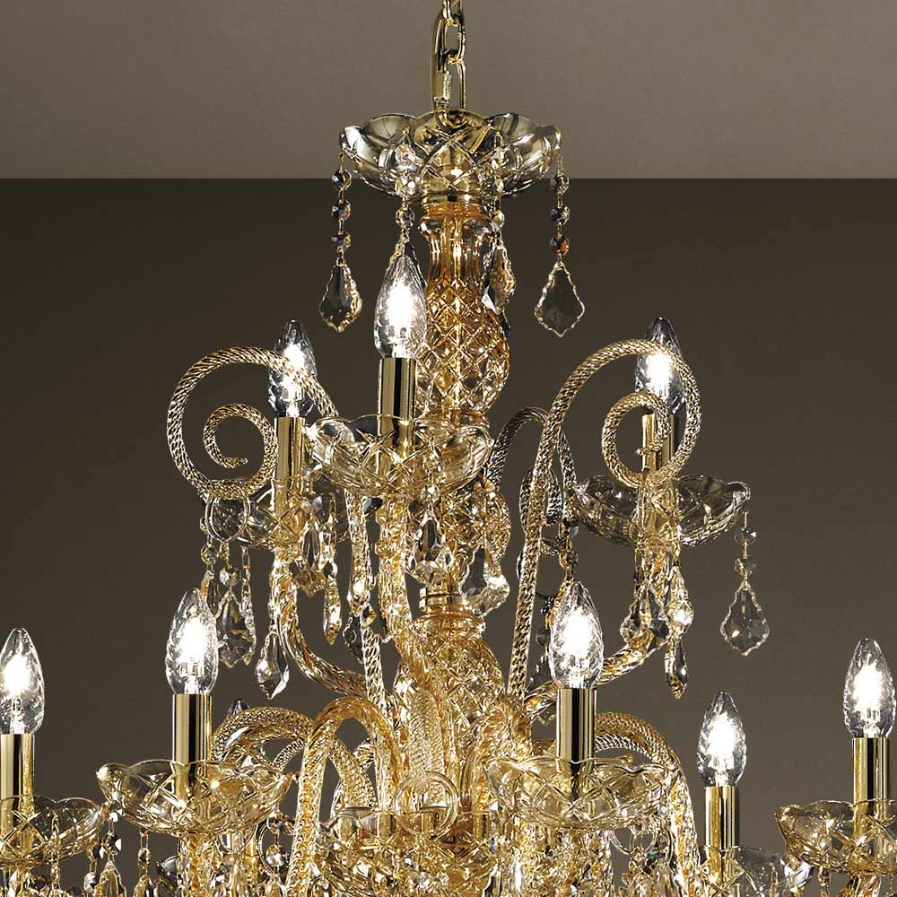 Ljuskrona med 27 lampor gjorda av Venedigglas med bärnstensdekoration med nationella hängen och detaljer i blank gyllene metall . Tillverkad genom ett hantverk , kännetecknas detta komplement av de underbara armarna arbetade för hand genom vridningstekniken som skapar ett exklusivt resultat som estetiskt påminner om sammanflätningen av ett rep, vilket ger personlighet till ljuskronan. Ett riktigt ljusregn invaderar ljuskronans struktur och sprider sig sedan in i den omgivande miljön med hjälp av brytning genom magin med paljetter och kristallhängen med fina ytbehandlingar, vilket skapar en suggestiv och drömlik scenografisk effekt som kan förtrolla och överraska. för dess elegans och majestät .
