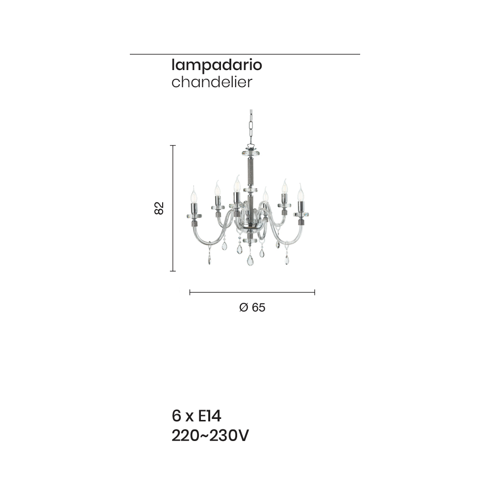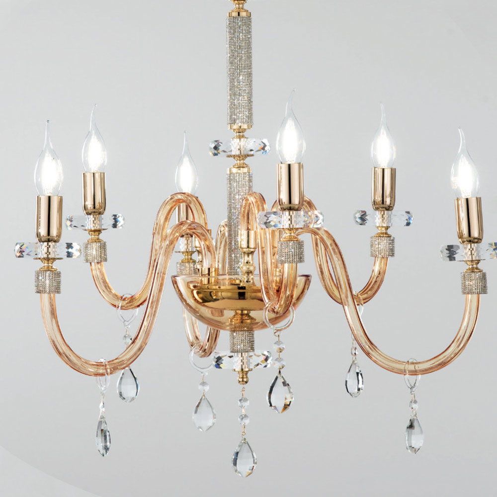 Denna hängande ljuskrona i klassisk stil består av 6 välvda armar gjorda av handgjort glas i Italien, bärnstensfärgad "rigaton"-effekt, vars ände är omgiven av glitter i metallen, såväl som den centrala delen av komplementet, där två rör cirkulära skivor stödjer strukturen varvat med två cirkulära skivor av olika storlekar gjorda av skuren kristall.