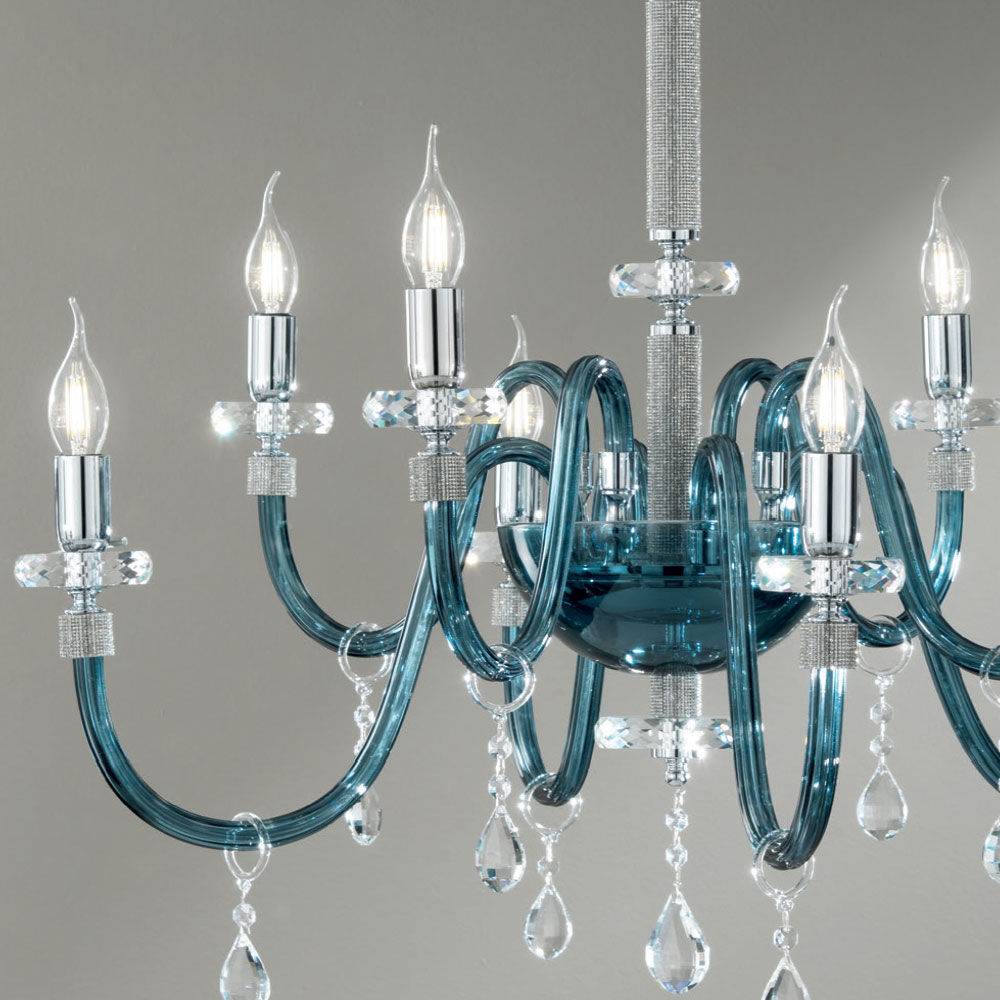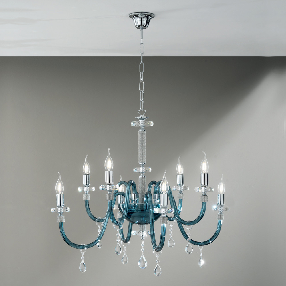 Denna hängande ljuskrona i klassisk stil består av 8 välvda armar gjorda av handgjorda glas i italiensk kricka med "rigaton"-effekt, vars ände är omgiven av glitter i metallen, såväl som den centrala delen av komplementet , där två rör cirkulära skivor stödjer strukturen varvat med två cirkulära skivor av olika storlekar gjorda av skuren kristall.