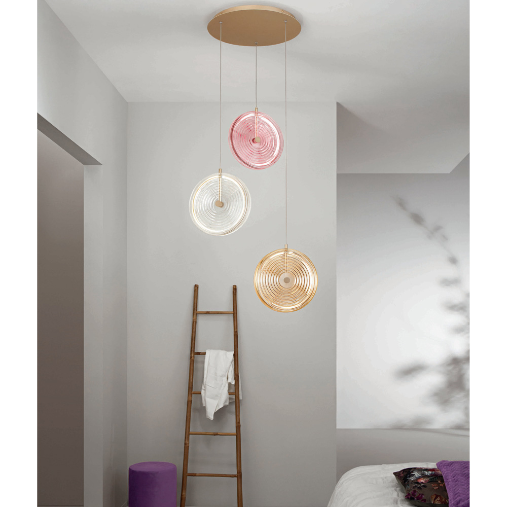 guldlackerad metall, glas dekorerad med koncentrisk bärnsten, rosa och transparenta linjer med