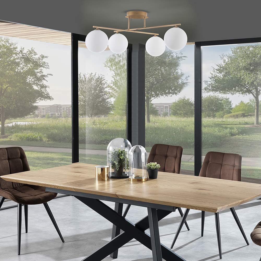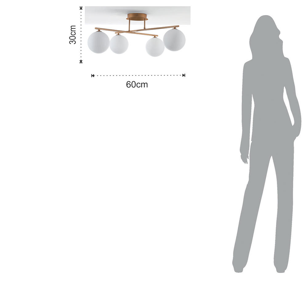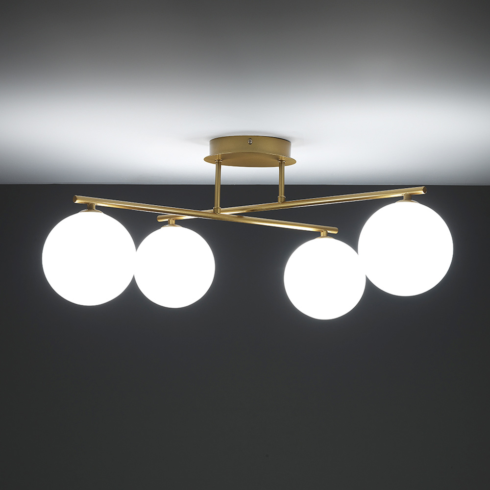 Denna ljuskrona representerar ett utmärkt exempel på elegant och modern design , perfekt för att lägga till en touch av stil och förfining till alla miljöer. Med fyra ogenomskinliga glaskulor upphängda i en metallstruktur skapar denna ljuskrona en diffus och behaglig belysning, perfekt för miljöer som matsalen, vardagsrummet eller till och med en hall.