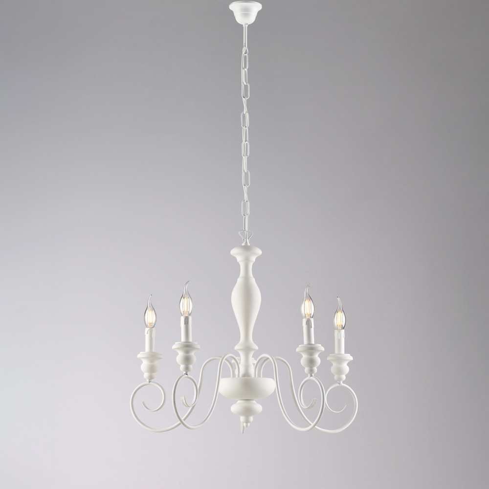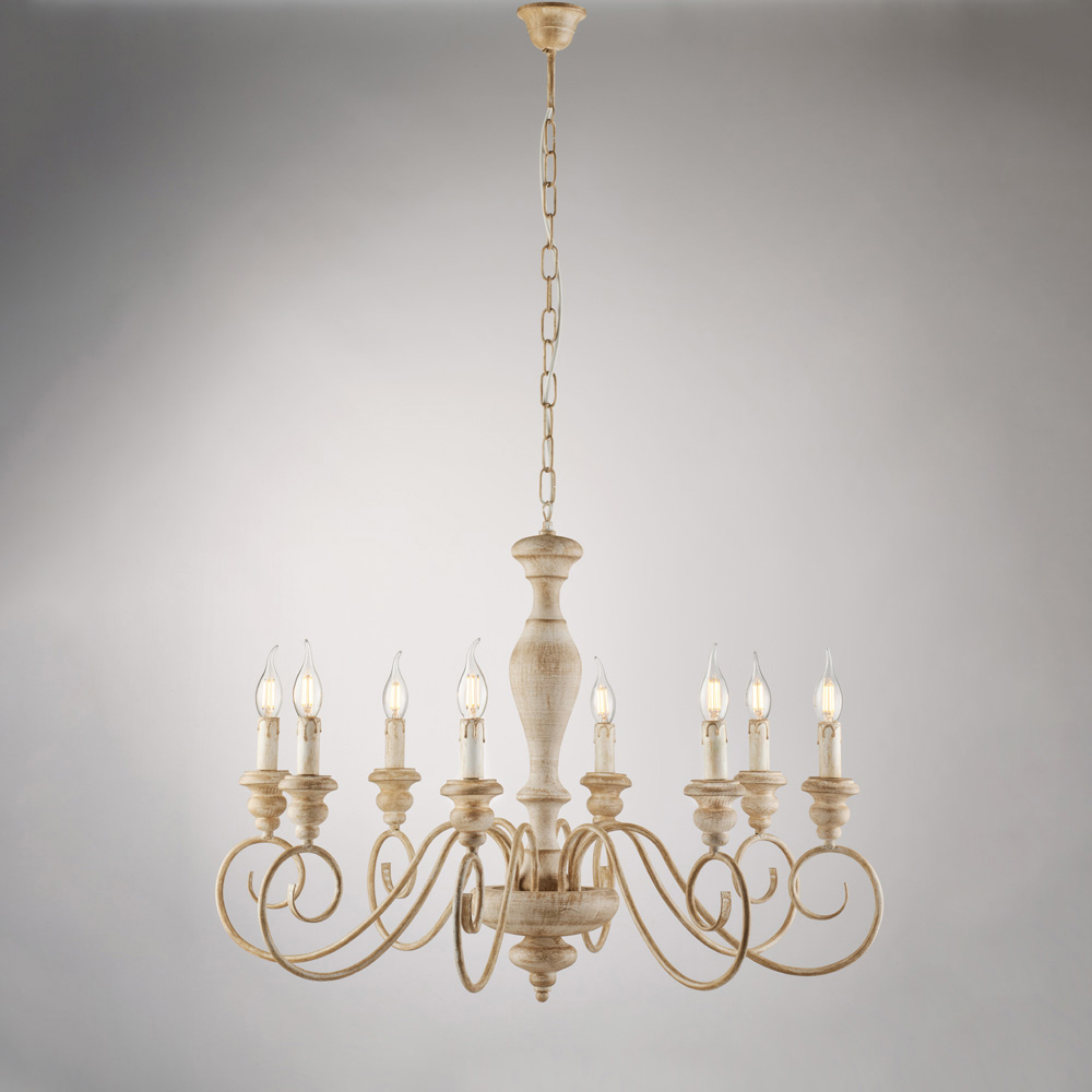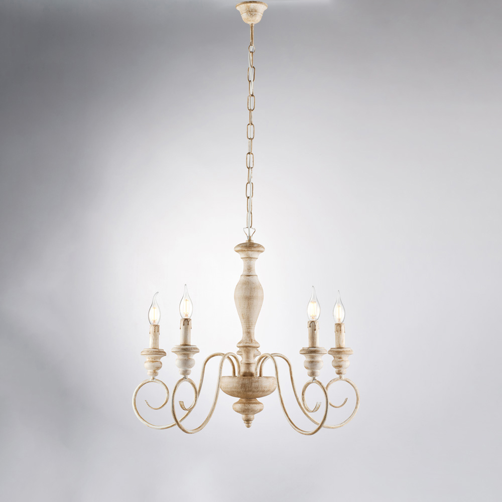 Denna klassiska ljuskrona, handgjord i trä och järn, är elegant och tidlös och en lysande skapelse som uttrycker all charm i shabby chic- stilen, omtolkad med en raffinerad touch. Den smala strukturen, med slingrande armar och ljus i stearinljusstil , ger lätthet och harmoni till rummet och skapar en varm och välkomnande atmosfär.