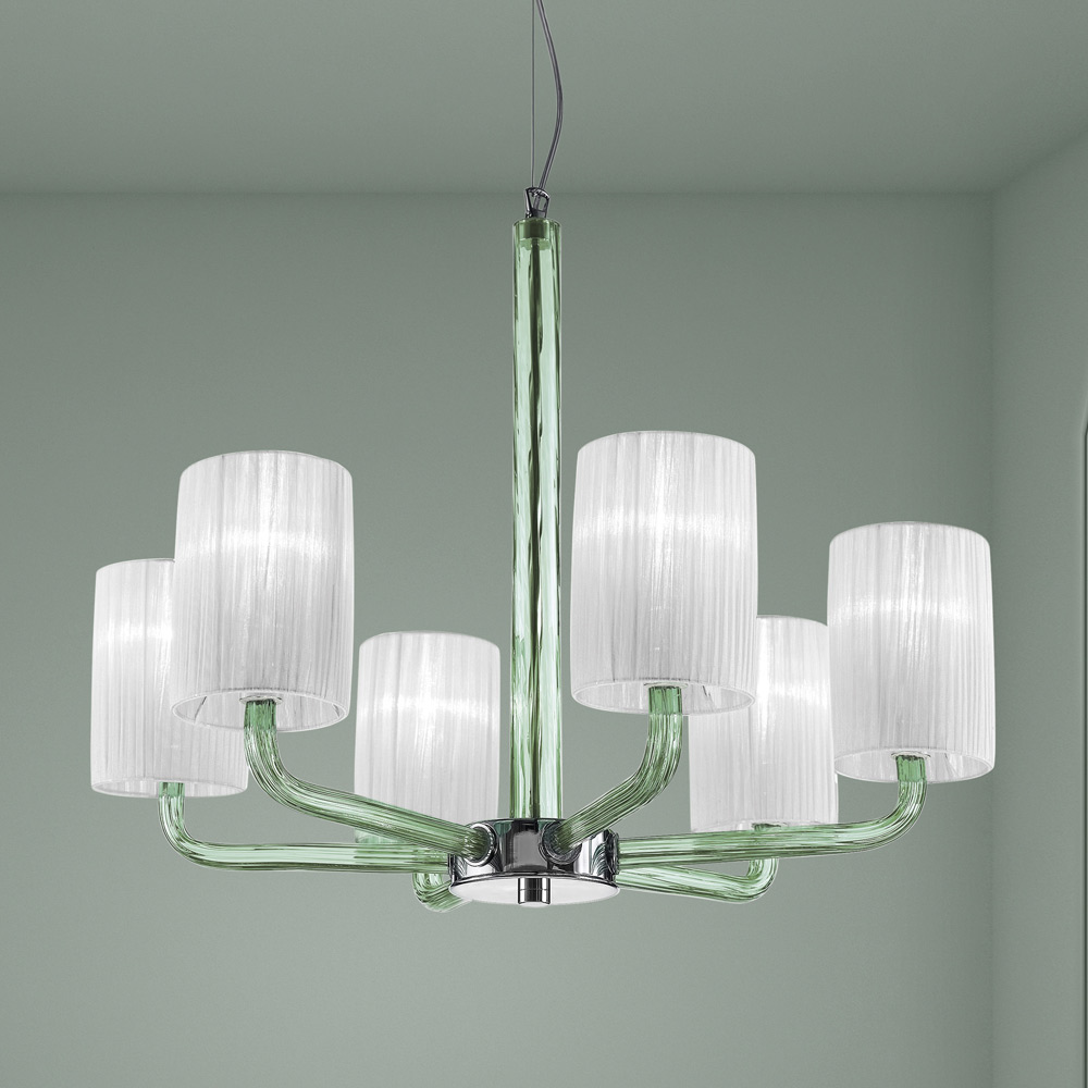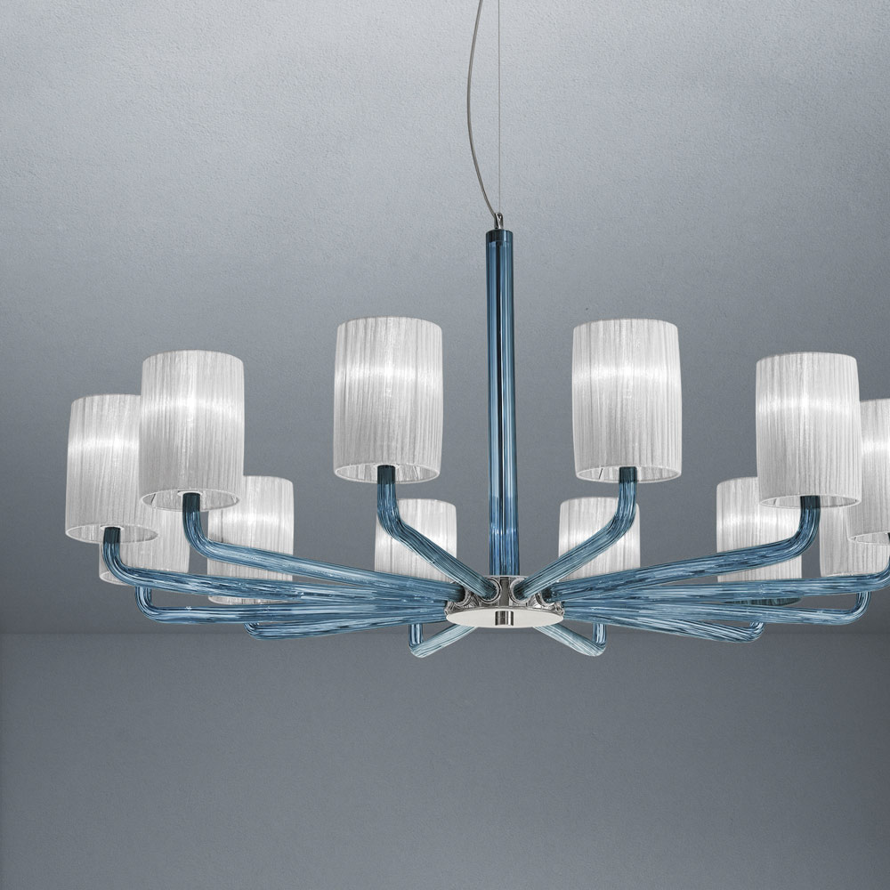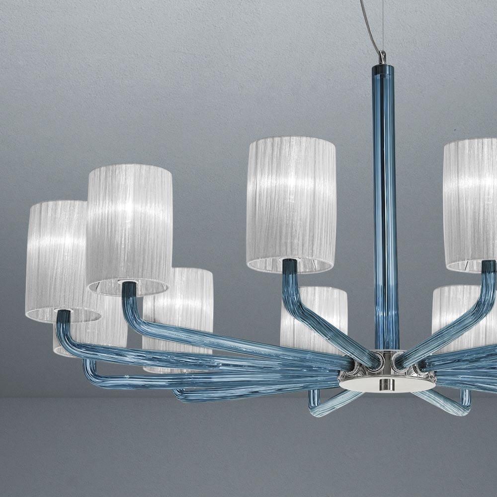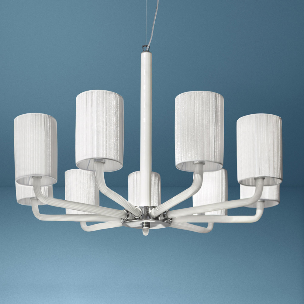 starka scennärvaro som är typisk för det förflutnas klassiska ljuskronor. De rörformade glasarmarna stödjer på ett delikat och elegant sätt de underbara lampskärmarna i tyg som hjälper till att bära ljuset åt alla håll för en