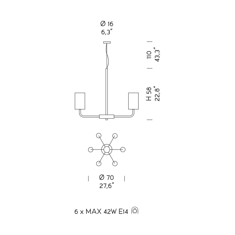 Glödlampor (ingår ej) : 6, 9 eller 12 x MAX 42W E14