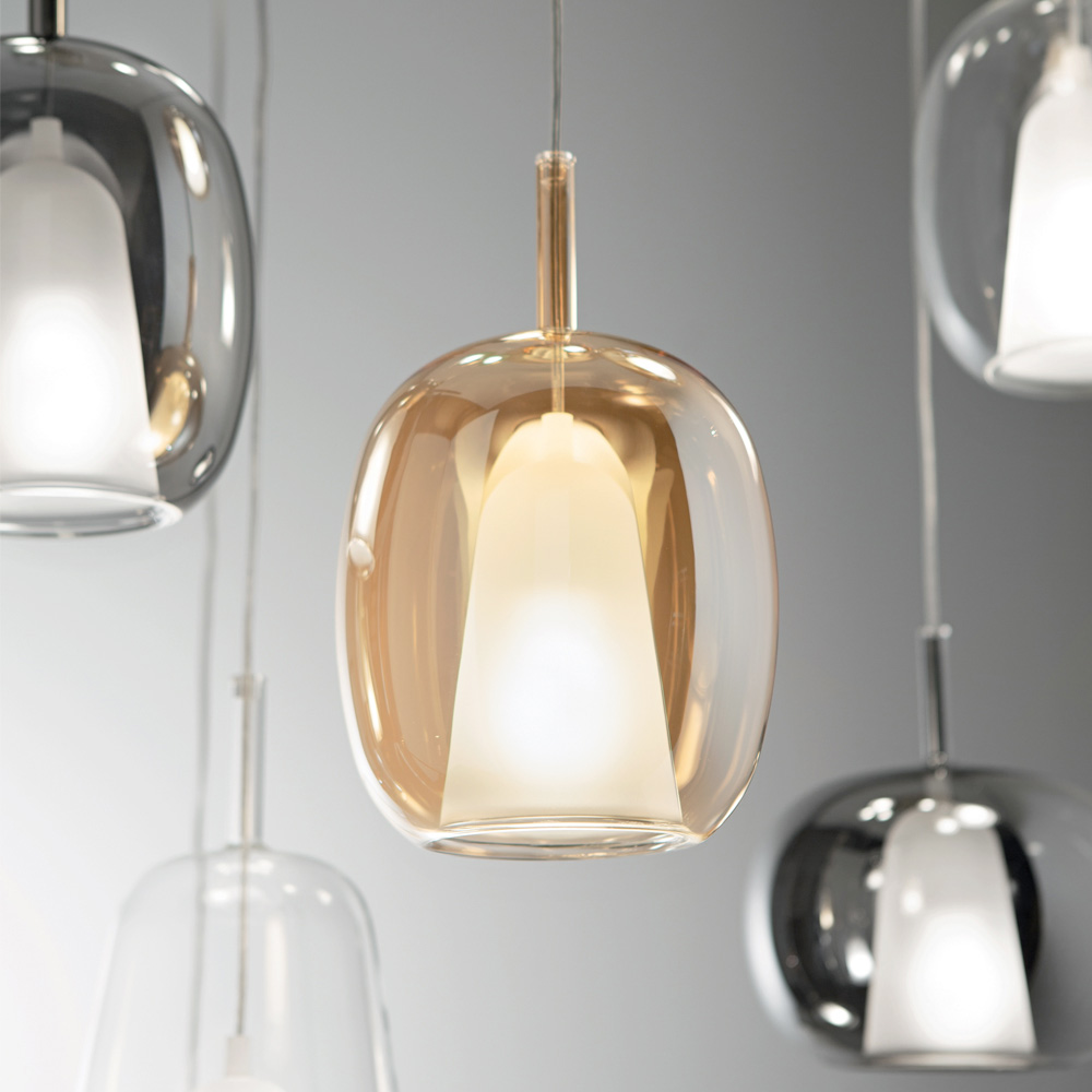 färgat glas . Lock i polymermaterial för att stabilisera kabeln i ett centralt läge. Justerbara kablar med en maxlängd på 250 cm.