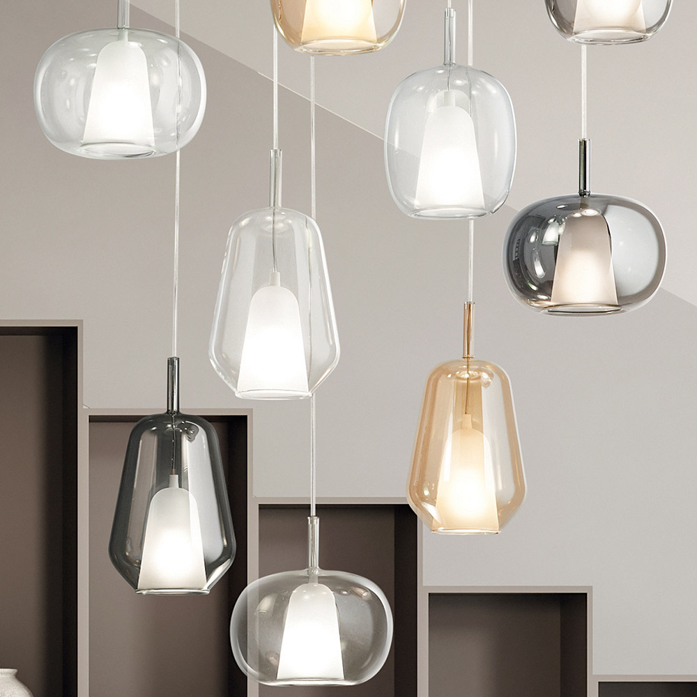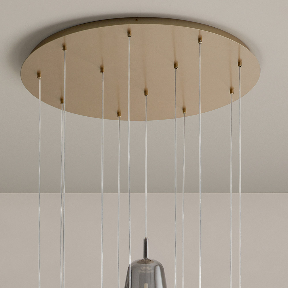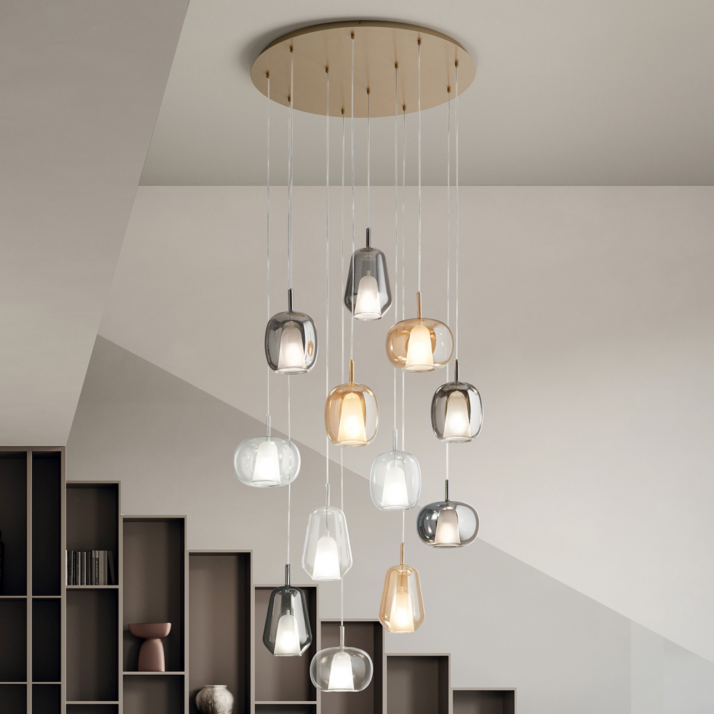 Upptäck charmen med sofistikerad belysning med denna ljuskrona, designad för att ingjuta elegans och värme i alla utrymmen. Diffusorerna, upphängda i en tunn tråd, har olika finish, reflekterar ett välkomnande och inbjudande ljus som berikar miljön med en touch av raffinerad modernitet .