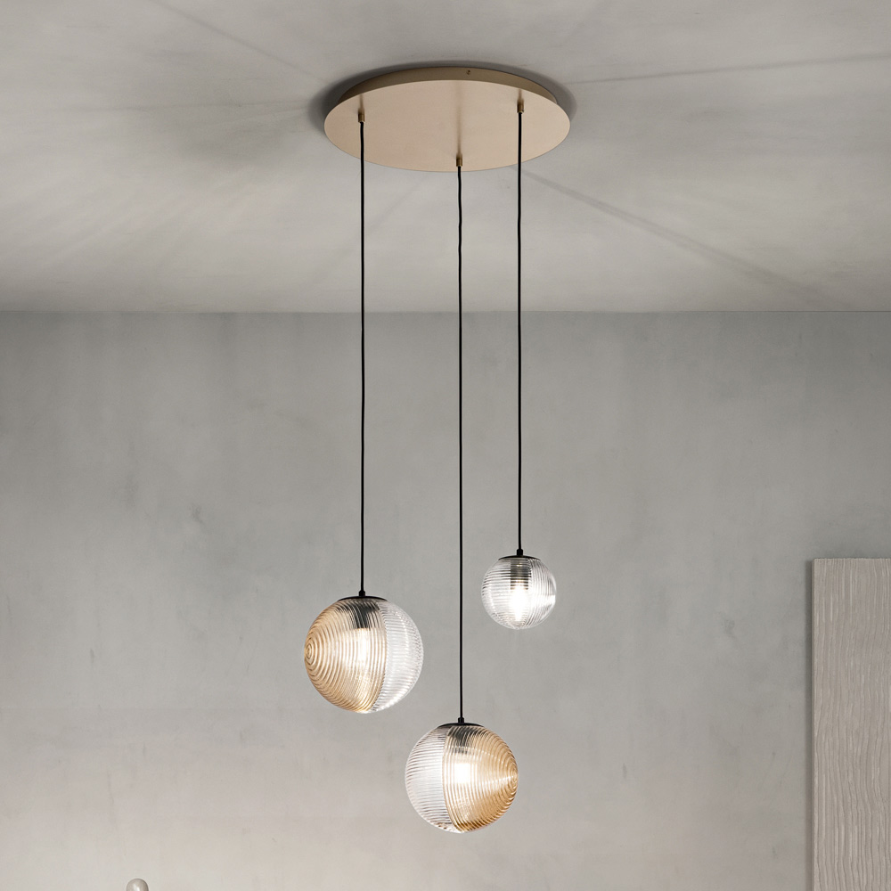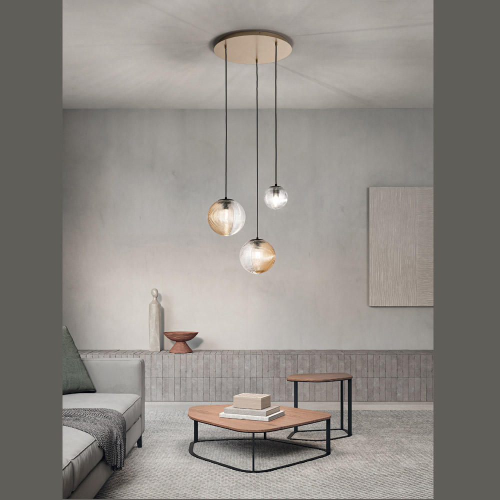 Fördjupa dig i en atmosfär av modern elegans med denna hängande ljuskrona, perfekt för att lägga till en touch av diskret lyx till alla utrymmen. De lysande sfärerna hänger i en harmonisk dans av ljus och reflektioner , var och en inkapslad i blåst glas med olika finish, som reflekterar ett varmt och välkomnande ljus .