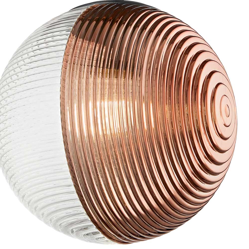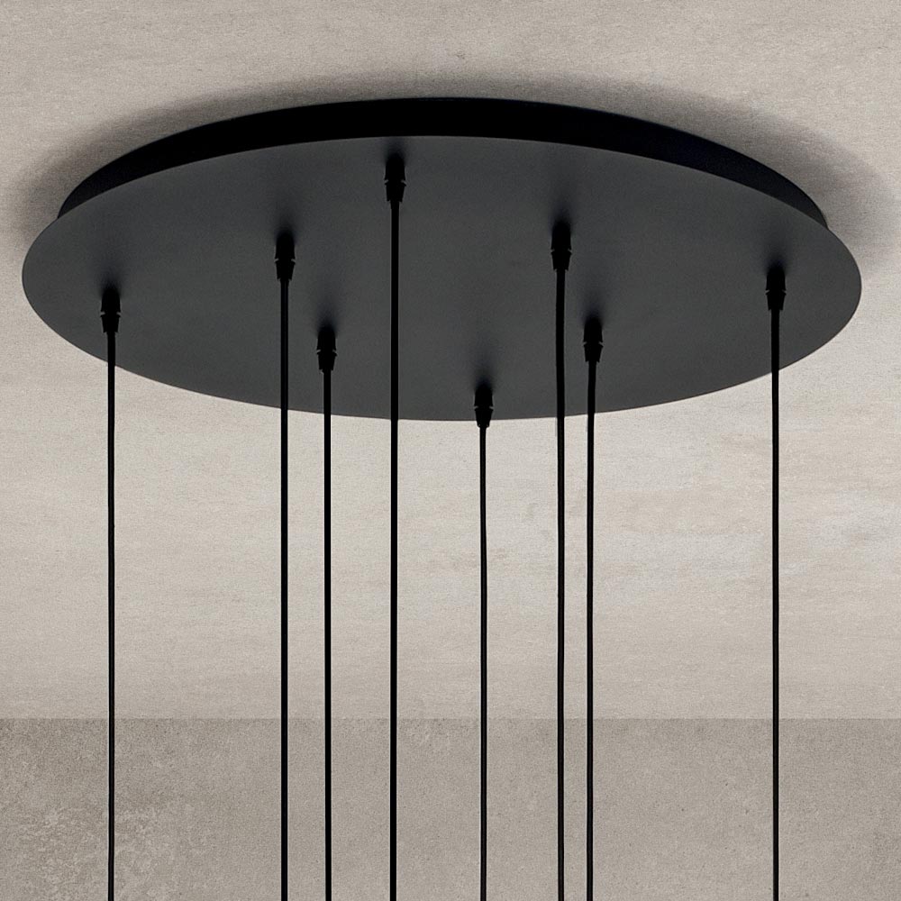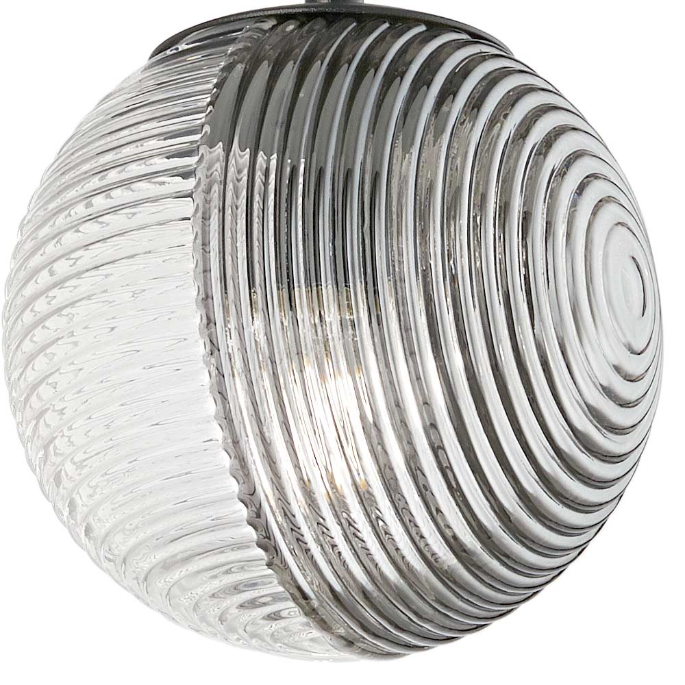 Ljuskrona gjord av blåst glas i en sfärisk form med en halvsfärisk linje uppdelad i två delar: en transparent och en färgad. Stomme i mattsvartlackerad metall och sockel i taket i svart metall . Justerbara kablar med en maxlängd på 250 cm.