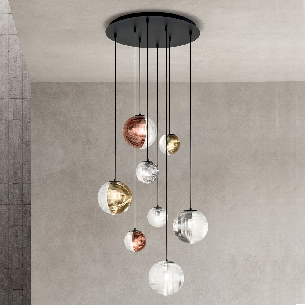 Fördjupa dig i en atmosfär av modern elegans med denna hängande ljuskrona, perfekt för att lägga till en touch av diskret lyx till alla utrymmen. De lysande sfärerna hänger i en harmonisk dans av ljus och reflektioner , var och en inkapslad i blåst glas med olika finish, som reflekterar ett varmt och välkomnande ljus .
